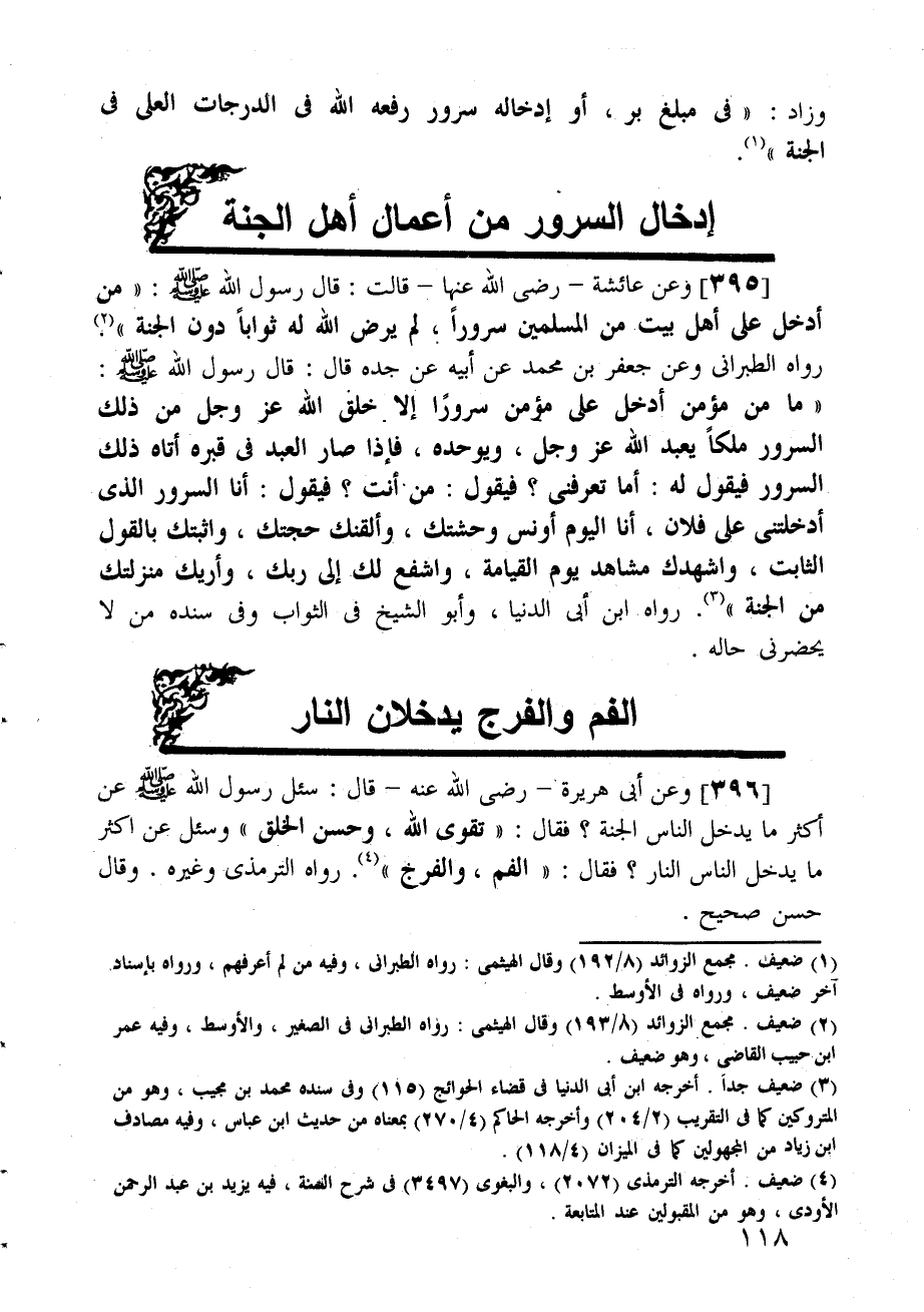 وعن عائشة - رضي الله عنها - قالت: قال رسول الله صلى الله عليه وسلم: (من أدخل على أهل بيت من المسلمين سرورا لم يرض الله له ثوابا دون الجنة) رواه الطبراني وعن جعفر بن محمد عن أبيه عن جده قال: قال رسول الله صلى الله عليهوسلم: (ما من مؤمن أدخل على مؤمن سرورا إلا خلق الله عز وجل من ذلك السرور ملكا يعبد الله عز وجل، ويوحده، فإذا صار العبد في قبره أتاه ذلك السرور فيقول له: أما تعرفني؟ فيقول: من أنت؟ فيقول: أنا السرور الذي أدخلتني على فلان، أنا اليوم أونس وحشتك، وألقنك حجتك، واثبتك بالقول الثابت، وأشهدك مشاهد يوم القيامة، واشفع لك إلى ربك، وأريك منزلتك من الجنة) رواه ابن أبى الدنيا، وأبو الشيخ في الثواب وفي سنده من لا يحضرني حاله.