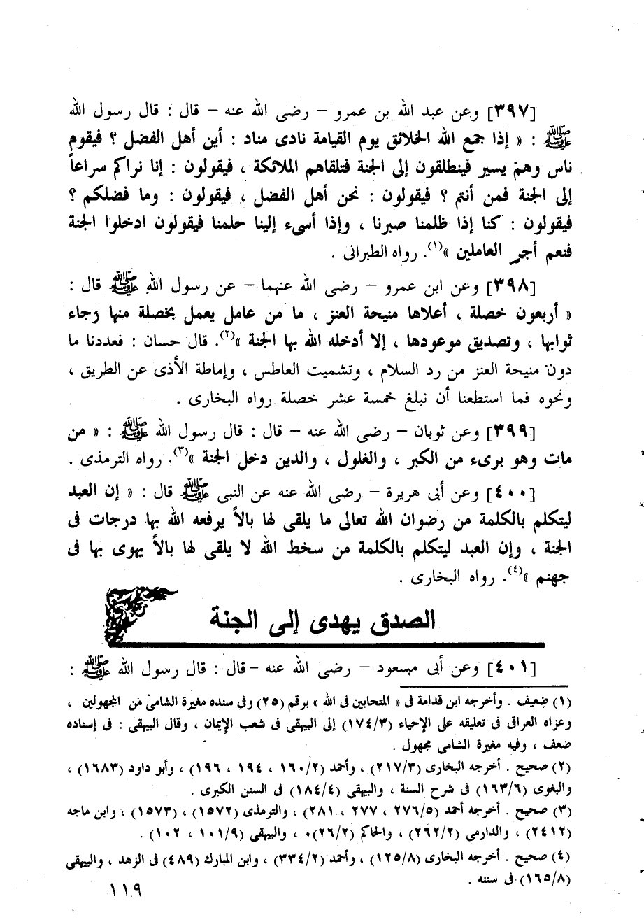 وعن ابن عمرو - رضي الله عنهما - عن رسول الله صلى الله عليه وسلم قال: (أربعون خصلة، أعلاها منيحة العنز، ما من عامل يعمل بخصلة منها رجاء ثوابها، وتصديق موعودها، إلا أدخله الله بها الجنة) قال حسان: فعددنا ما دون منيحة العنز من رد السلام، وتشميت العاطس، وإماطة الأذى عن الطريق، ونحوه فما استطعنا أن نبلغ خمسة عشر خصلة. رواه البخاري.