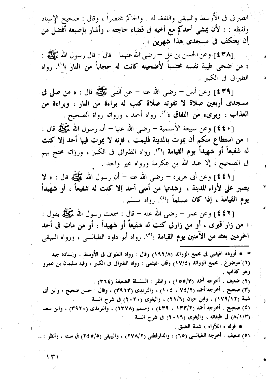وعن سبيعة الأسلمية - رضي الله عنها - أن رسول الله صلى الله عليه وسلم قال: (من استطاع منكم أن يموت بالمدينة فليمت، فإنه لا يموت فيها أحد إلا كنت له شفيعا أو شهيدا يوم القيامة) . رواه الطبراني في الكبير، ورواته محتج بهم في الصحيح، إلا عبد الله بن عكرمة ورواه غير واحد.