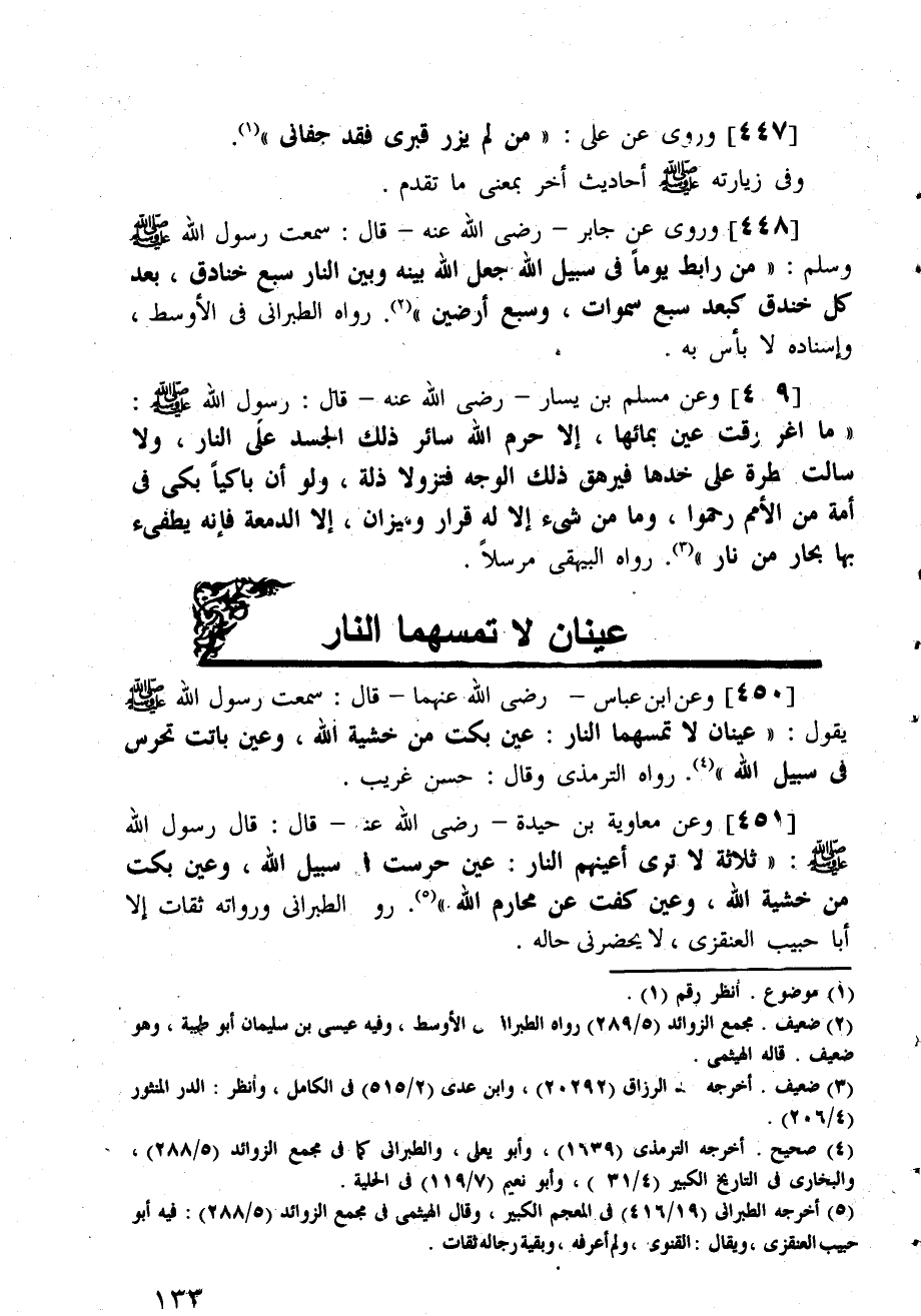 وعن معاوية بن حيدة - رضي الله عنه - قال: قال رسول الله صلى الله عليه وسلم: (ثلاثة لا ترى أعينهم النار: عين حرست في سبيل الله، وعين بكت من خشية الله، وعين كفت عن محارم الله) رواه الطبراني ورواته ثقات إلا أبا حبيب العنقزي، لا يحضرني حاله.