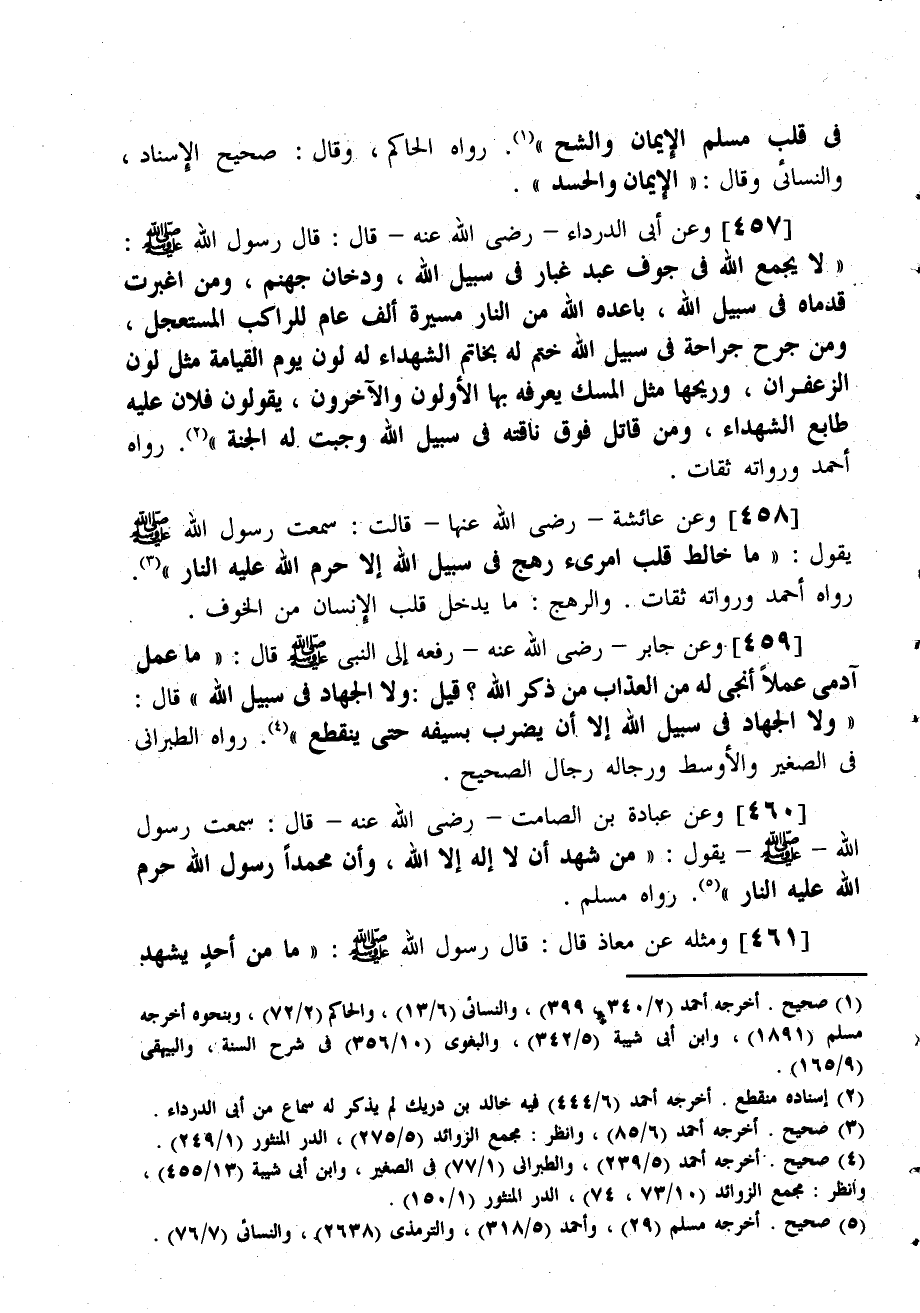 وعن أبي الدرداء - رضي الله عنه - قال: قال رسول الله صلى الله عليه وسلم: (لا يجمع الله في جوف عبد غبار في سبيل الله، ودخان جهنم، ومن اغبرت قدماه في سبيل الله، باعده الله من النار مسيرة ألف عام للراكب المستعجل، ومن جرح جراحة في سبيل الله ختم له بخاتم الشهداء له لون يوم القيامة مثل لون الزعفران، وريحها مثل المسك يعرفه بها الأولون والآخرون، يقولون فلان عليه طابع الشهداء، ومن قاتل فوق ناقته في سبيل الله وجبت له الجنة) . رواه أحمد ورواته ثقات.