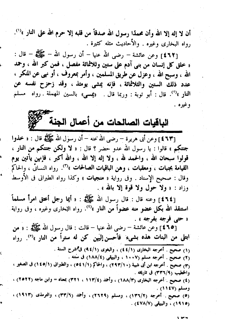وعن أبي هريرة - رضي الله عنه - أن رسول الله صلى الله عليه وسلم قال: (خذوا جنتكم) قالوا: يا رسول الله عدو حضر؟ قال: (لا ولكن جنتكم من النار، قولوا سبحان الله، والحمد لله، ولا إله إلا الله، والله أكبر، فإنهن يأتين يوم القيامة بجنبات، ومعقبات، وهن الباقيات الصالحات) رواه النسائي، والحاكم وقال: صحيح الإسناد. وفي رواية (منجيات) وكذا رواه الطبراني في الأوسط وزاد: (ولا حول ولا قوة إلا بالله) .