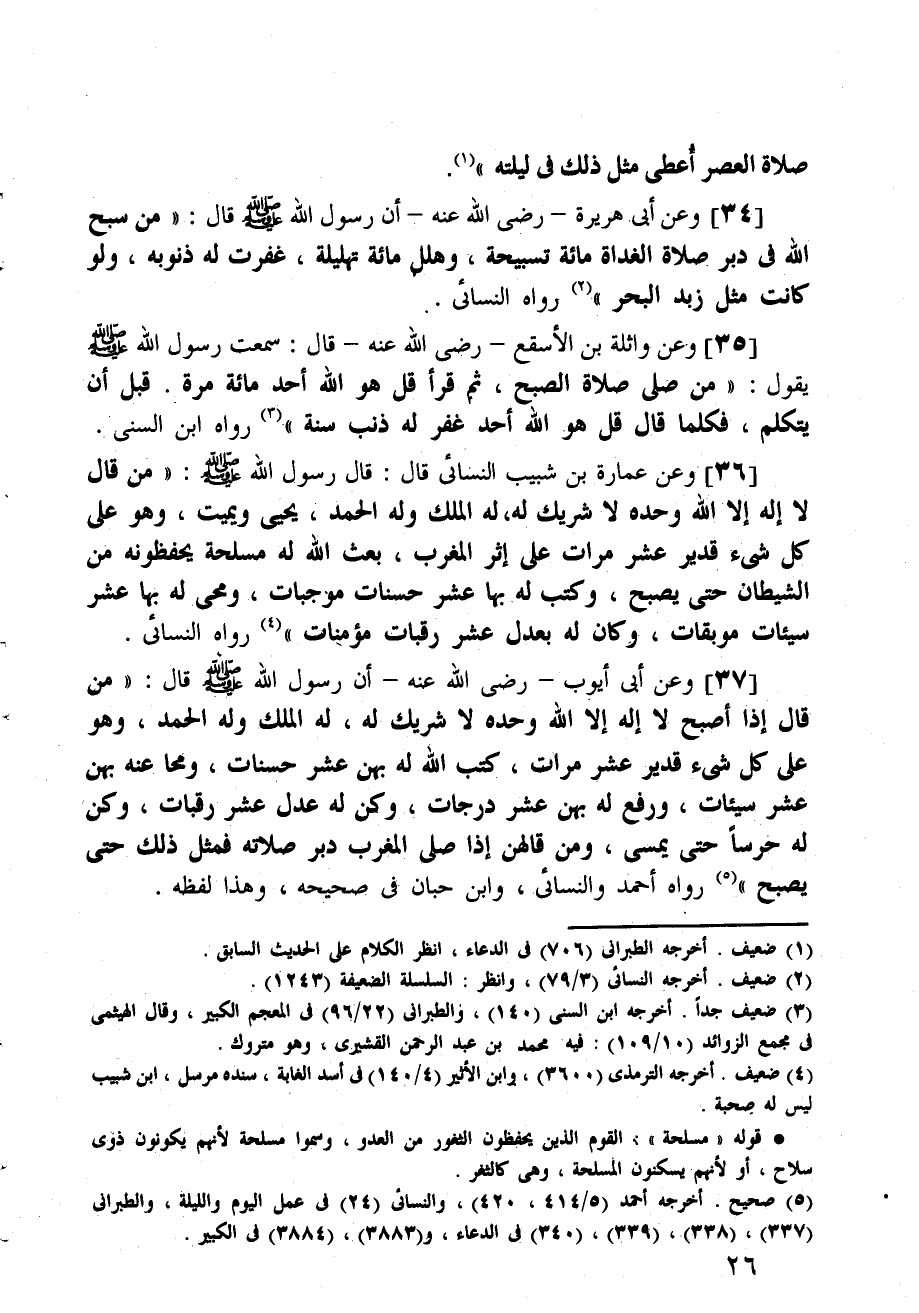 وعن أبي أيوب - رضي الله عنه - أن رسول الله صلى الله عليه وسلم قال: (من قال إذا أصبح لا إله إلا الله وحده لا شريك له، له الملك وله الحمد، وهو على كل شيء قدير عشرات مرات، كتب الله له بهن عشر حسنات، ومحا عنه بهن عشر سيئات، ورفع له بهن عشر درجات، وكن له عدل عشر رقبات، وكن له حرسا حتى يمسي، ومن قالهن إذا صلى المغرب دبر صلاته فمثل ذلك حتى يصبح) رواه أحمد والنسائي، وابن حبان في صحيحه، وهذا لفظه.