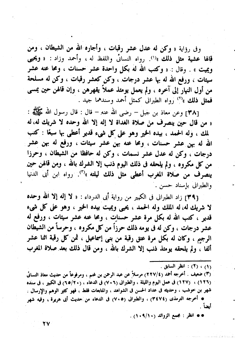 وفي رؤاية (وكن له عدل عشر رقبات، وأجاره الله من الشيطان، ومن قالها عشية مثل ذلك) . رواه النسائي واللفظ له، وأحمد وزاد: (ويحيى ويميت) . وقال: (وكتب الله له بكل واحدة عشر حسنات، ومحا عنه عشر سيئات، ورفع الهل له بها عشر درجات، وكن كعشر رقبات، وكن له مسلحة من أول النهار إلى آخره، ولم يعمل يومئذ عملا يقهرهن، وإن قالهن حين يمسي فمثل ذلك) رواه الطبراني كمثل أحمد وسندهما جيد.
