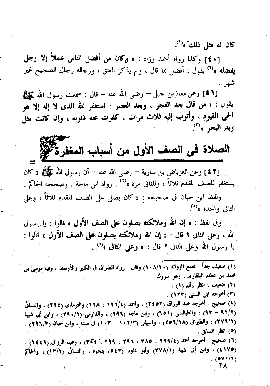 وعن العرباض بن سارية - رضي الله عنه - أن رسول الله صلى الله عليه وسلم (كان يستغفر للصف المقدم ثلاثا، وللثاني مرة) رواه ابن ماجه. وصححه الحاكم. ولفظ ابن حبان في صحيحه: (كان يصلي على الصف المقدم ثلاثا، وعلى الثاني واحدة) .