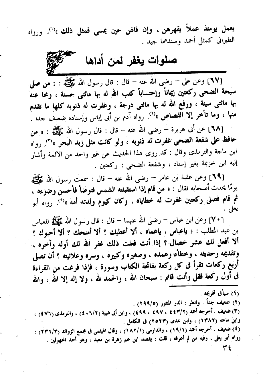 وعن علي - رضي الله عنه - قال: قال رسول الله صلى الله عليه وسلم: (من صلى سبحة الضحى ركعتين إيمانا وإحتسابا كتب الله له بها مائتي حسنة، ومحا عنه بها مائتي سيئة، ورفع الله له بها مائتي درجة، وغفرت له ذنوبه كلها ما تقدم منها، وما تأخر إلا القصاص) . رواه آدم بن أبي إياس وإسناده ضعيف جدا.