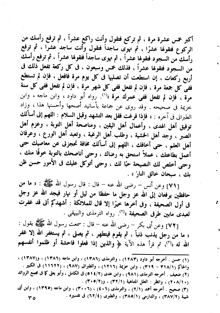أكبر خمس عشرة مرة، ثم تركع فتقول وأنت راكع عشرا، ثم ترفع رأسك من الركوع فتقولها عشرا، ثم تهوي ساجدا فتقول وأنت ساجد عشرا، ثم ترفع رأسك من السجود فتقولها عشرا، ثم تهوي ساجدا فتقولها عشرا، ثم ترفع رأسك من السجوها فتقولها عشرا، فذلك خمس وسبعون، في كل ركعة تفعل ذلك في أربع ركعات، إن استطعت أن تصليها في كل يوم مرة فافعل، فإن لم تستطع ففي كل جمعة مرة، فإن لم تفعل ففي كل شهر مرة، فإن لم تفعل ففي كل سنة مرة، فإن لم تفعل ففي عمرك مرة) . رواه أبو داود، وابن ماجه، وابن خزيمة في صحيحه. وقد روى عن جماعة بأسانيد أصحها وأحسنها هذا، وزاد الطبراني في آخره: (فإذا فرغت فقل بعد التشهد وقبل السلام: اللهم إني أسألك توفيق أهل الهدى، وأعمال أهل اليقين، ومناصحة أهل التوبة، وعزم أهل الصبر، وجدن أهل الخشية، وطلب أهل الرغبة، وتعبد أهل الورع، وعرفان أهل العلم، حتى أخافك، اللهم إني أسألك مخافة تحجزني عنمعاصيك حتى أعمل بطاعتك، عملا استحق به رضاك، وحتى أناصحك بالتوبة خوفا منك، وحتى أخلص لك النصيحة حبا لك، وحتى أتوكل عليك في الأمور حسن ظن بك، سبحان خالق النار) .