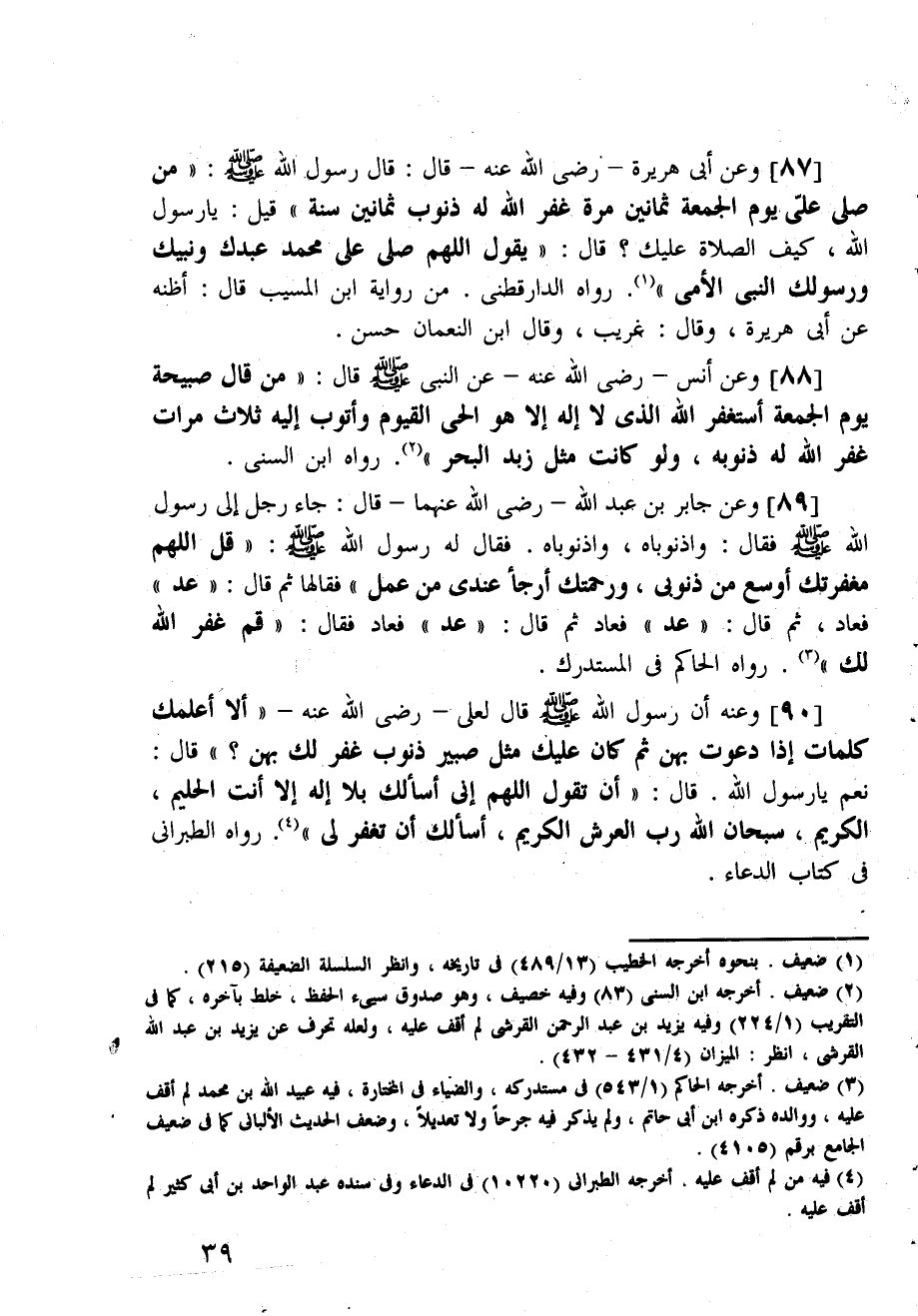 وعن أنس - رضي الله عنه - عن النبي صلى الله عليه وسلم قال: (من قال صبيحة يوم الجمعة أستغفر الله الذي لا إله إلا هو الحي القيوم وأتوب إليه ثلاث مرات غفر الله له ذنوبه، ولو كانت مثل زبد البحر) . رواه ابن السني.