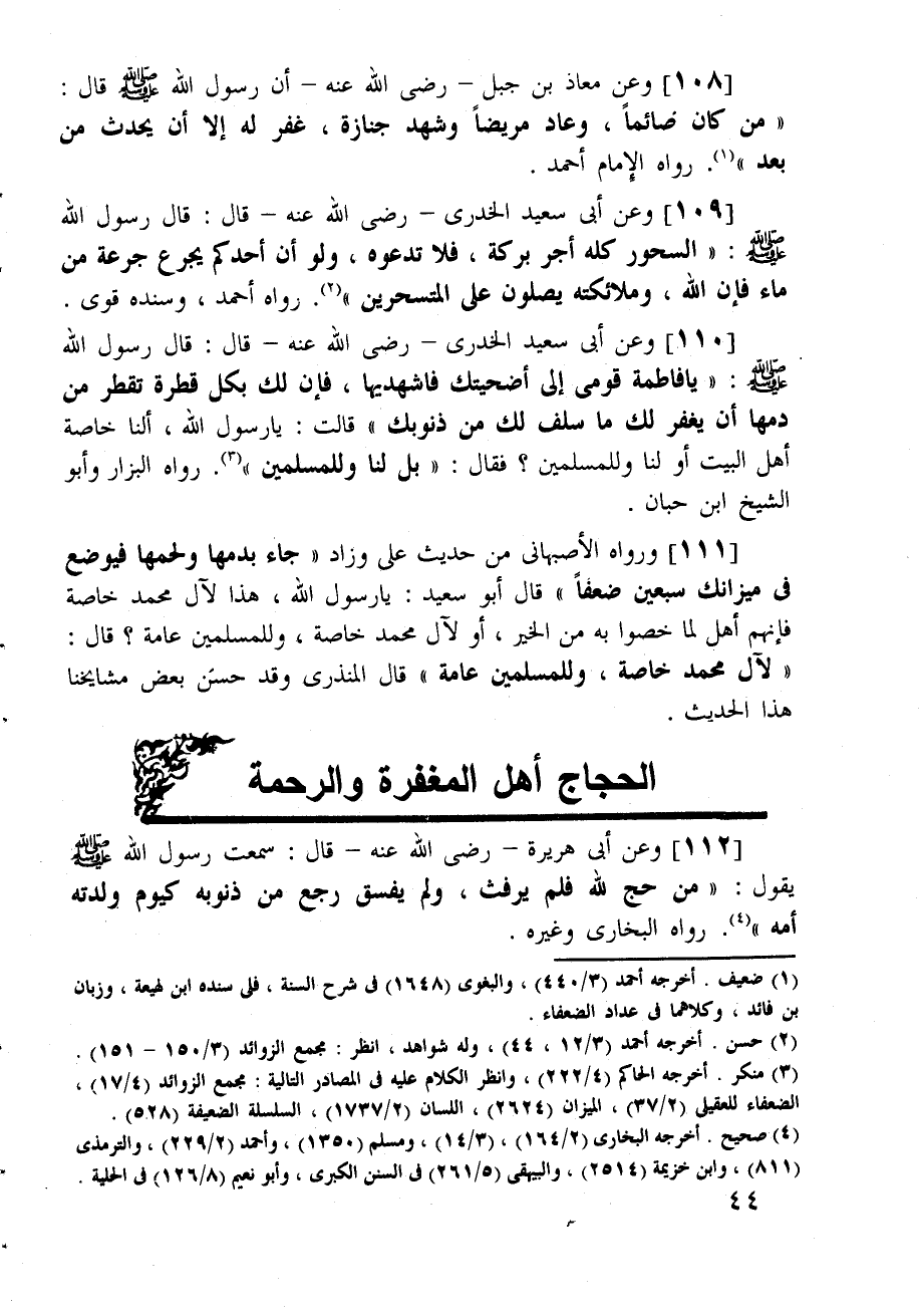 ورواه الأصبهاني من حديث على وزاد (جاء بدمها ولحمها فيوضع في ميزانك سبعين ضعفا) قال أبو سعيد: يا رسول الله، هذا لآل محمد خاصة فإنهم أهل لما خصوا به من الخير، أو لآل محمد خاصة، وللمسلمين عامة؟ قال: (لآل محمد خاصة، وللمسلمين عامة) قال المنذري وقد حسن بعض مشايخنا هذا الحديث.