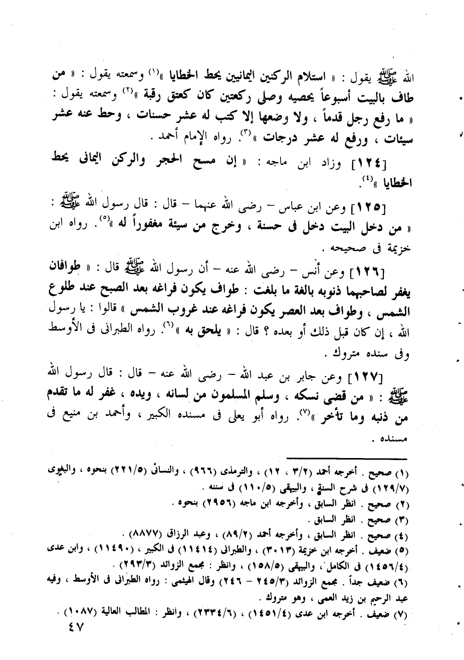 الله صلى الله عليه وسلم يقول: (استلام الركنين اليمانيين يحط الخطايا) وسمعته يقول: (من طاف بالبيت أسبوعا يحصيه وصلى ركعتين كان كعتق رقبة) وسمعته يقول: (ما رفع رجل قدما، ولا وضعها إلا كتب له عشر حسنات، وحط عنه عشر سيئات، ورفع له عشر درجات) . رواه الإمام أحمد.
