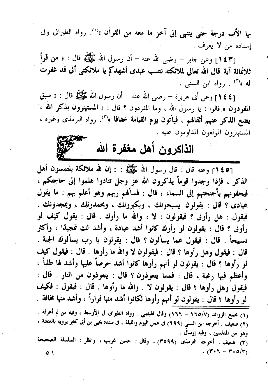 وعن أبي هريرة - رضي الله عنه - أن رسول الله صلى الله عليه وسلم قال: (سبق المفردون) قالوا: يا رسول الله، وما المفردون؟ قال: (المستهترون بذكر الله، يضع الذكر عنهم أثقالهم، فيأتون يوم القيامة خفافا) . رواه الترمذي وغيره، المستهترون المولعون المداومون عليه.