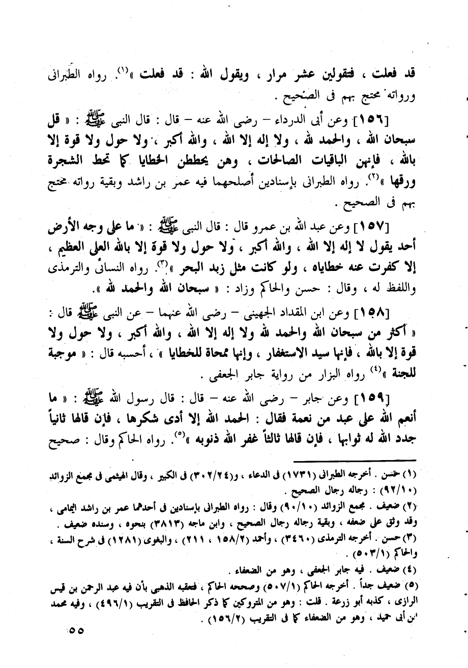 وعن عبد الله بن عمرو قال: قال النبي صلى الله عليه وسلم: (ما على وجه الأرض أحد يقول لا إله إلا الله، والله أكبر، ولا حول ولا قوة إلا بالله العلي العظيم، إلا كفرت عنه خطاياه، ولو كانت مثل زبد البحر) رواه النسائي والترمذي واللفظ له، وقال: حسن والحاكم وزاد: (سبحان الله والحمد لله) .