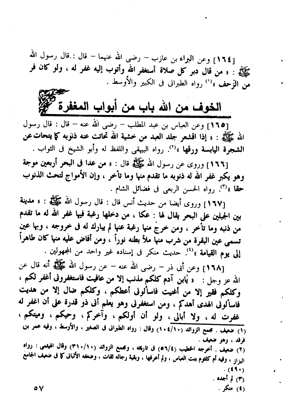 وعن البراء بن عازب - رضي الله عنهما - قال: قال رسول الله صلى الله عليه وسلم: (من قال دبر كل صلاة أستغفر الله وأتوب إليه غفر له، ولو كان فر من الزحف) رواه الطبراني في الكبير والأوسط.