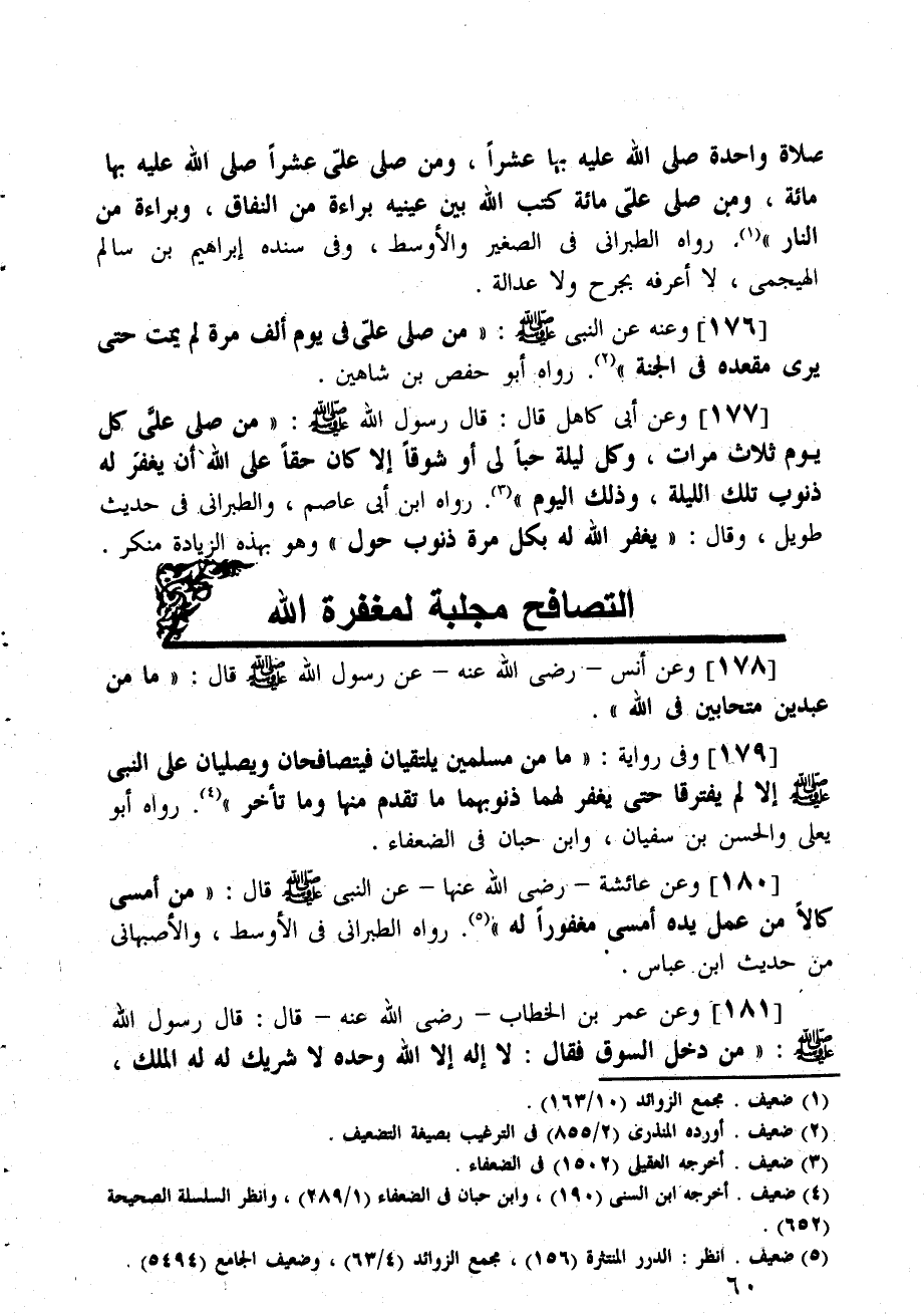 وعن عمر بن الخطاب - رضي الله عنه - قال: قال رسول الله صلى الله عليه وسلم: (من دخل السوق فقال: لا إله إلا الله وحده لا شريك له له الملك،