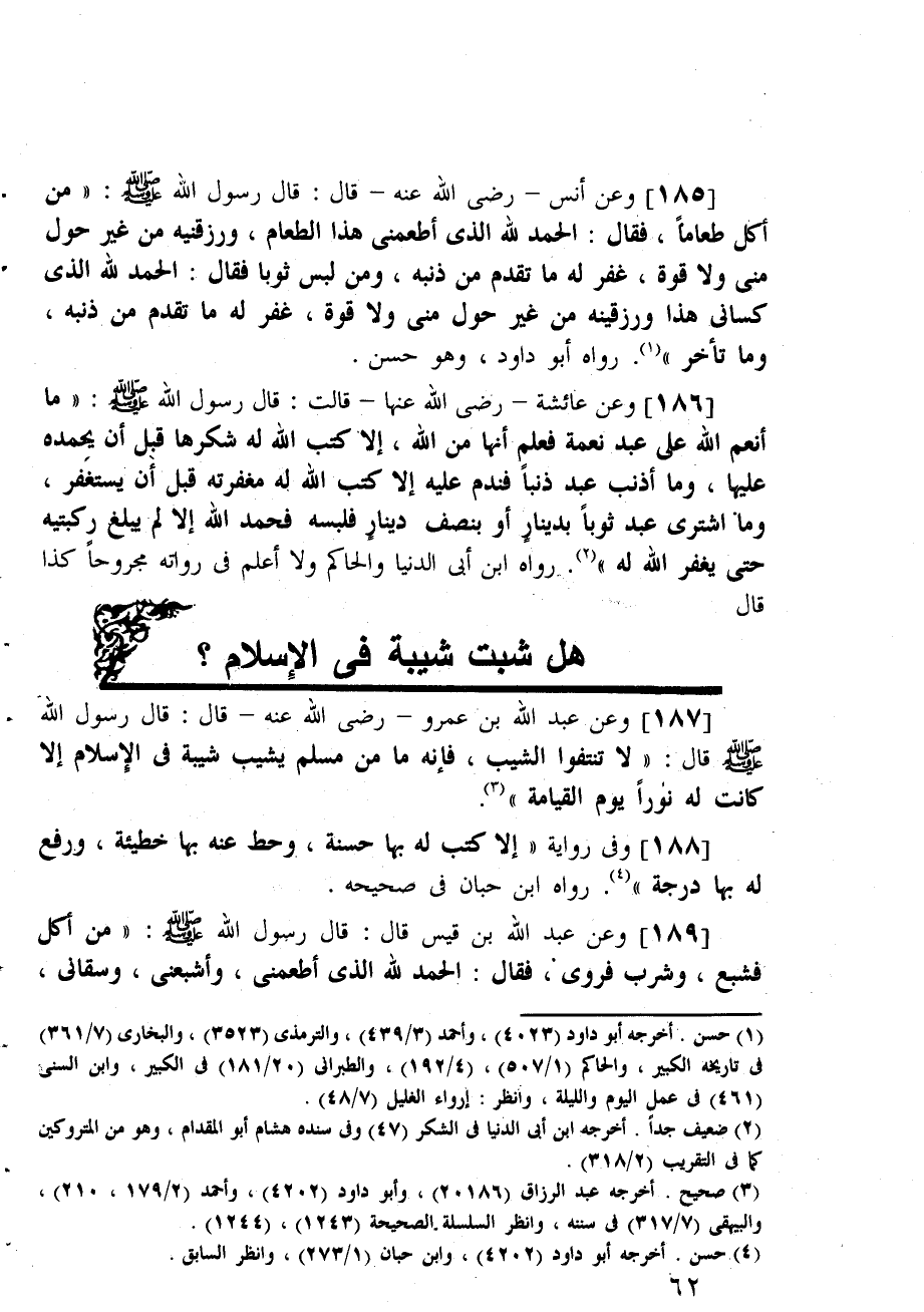 وعن عبد الله بن عمرو - رضي الله عنه - قال: قال رسول الله صلى الله عليه وسلم قال: (لا تنتفوا الشيب، فإنه ما من مسلم يشيب شيبة في الإسلام إلا كانت له نورا يوم القيامة؟ وفي رواية (إلا كتب له بها حسنة، وحط عنه بها خطيئة، ورفع فشبع، وشرب فروى، فقال: الحمد لله الذي أطعمني، وأشبعني، وسقاني،