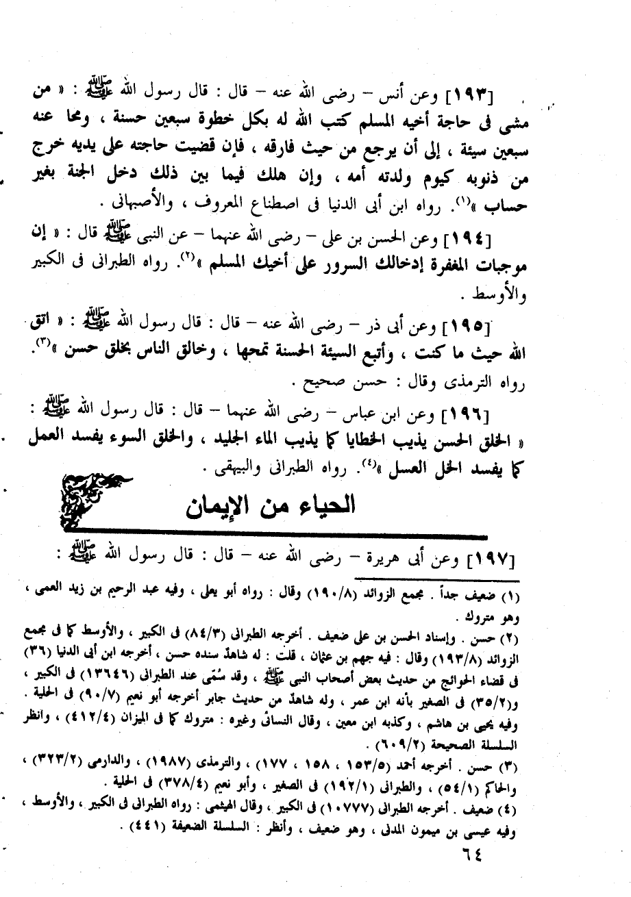 وعن أنس - رضي الله عنه - قال: قال رسول الله صلى الله عليه وسلم: (من مشى في حاجة أخيه المسلم كتب الله له بكل خطوة سبعين حسنة، ومحا عنه سبعين سيئة، إلى أن يرجع من حيث فارقه، فإن قضيت حاجته على يديه خرج من ذنوبه كيوم ولدته أمه، وإن هلك فيما بين ذلك دخل الجنة بغير حساب) . رواه إبن أبي الدنيا في اصطناع المعروف، والأصبهاني.