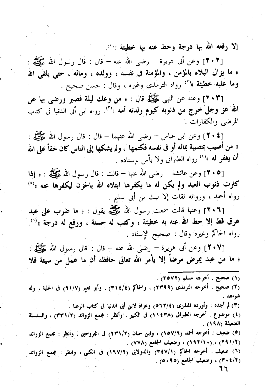 وعن أبي هريرة - رضي الله عنه - قال: قال رسول الله صلى الله عليه وسلم: (ما يزال البلاء بالمؤمن، والمؤمنة في نفسه، وولده، وماله، حتى يلقى الله وما عليه خطيئة) رواه الترمذي وغيره، وقال: حسن صحيح.