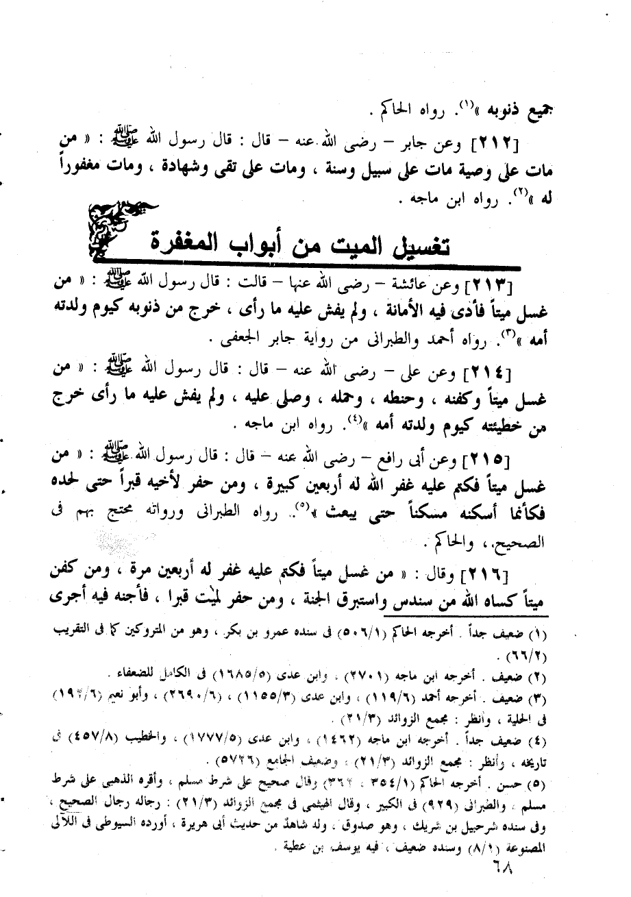 وعن علي - رضي الله عنه - قال: قال رسول الله صلى الله عليه وسلم: (من غسل ميتا وكفنه، وحنطه، وحمله، وصلى عليه، ولم يفش عليه ما رأى خرج من خطيئته كيوم ولدته أمه) . رواه ابن ماجه.
