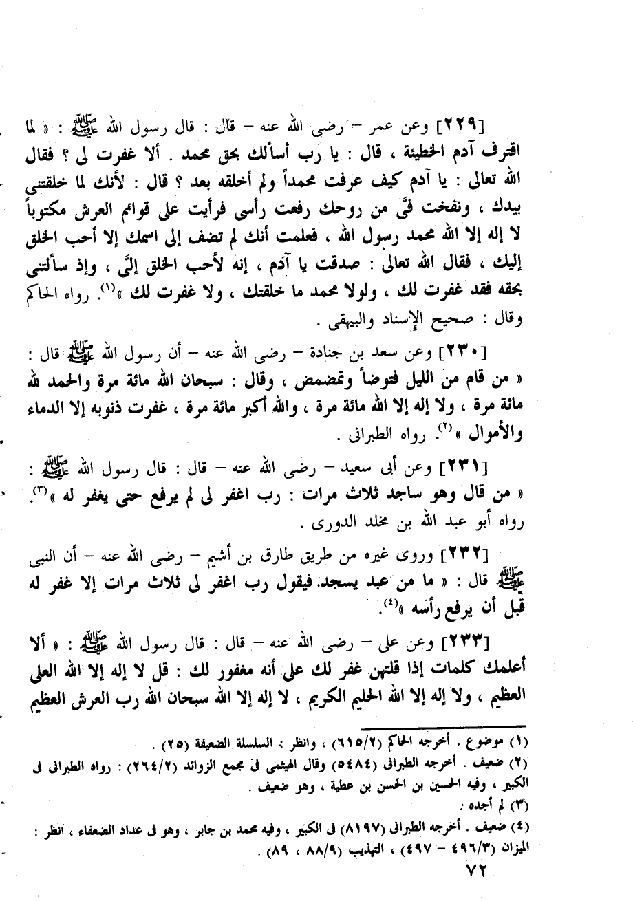 وعن علي - رضي الله عنه - قال: قال رسول الله صلى الله عليه وسلم: (ألا أعلمك كلمات إذا قلتهن غفر لك على أنه مغفور لك: قل لا إله إلا الله العلي العظيم، ولا إله إلا الله الحليم الكريم، لا إله إلا الله سبحان الله رب العرش العظيم
