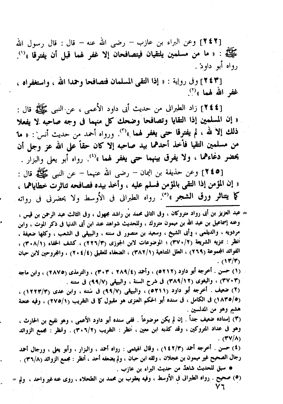 وعن البراء ببن عازب - رضي الله عنه - قال: قال رسول الله صلى الله عليه وسلم: (ما من مسلمين يلتقيان فيتصافحان إلا غفر لهما لهما قبل أن يفترقا) . رواه أبو داود.