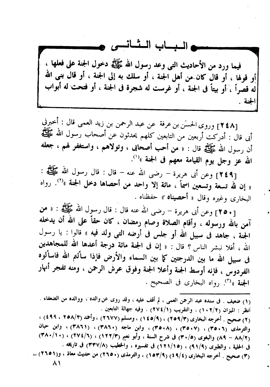 فيما ورد من الأحاديث التي وعد رسول الله صلى الله عليه وسلم دخول الجنة على فعلها، أو قولها، أو قال كان من أهل الجنة، أو سلك به إلى الجنة، أو قال بنى الله له قصرا، أو بيتا في الجنة، أو غرست له شجرة في الجنة، أو فتحت له أبواب الجنة.