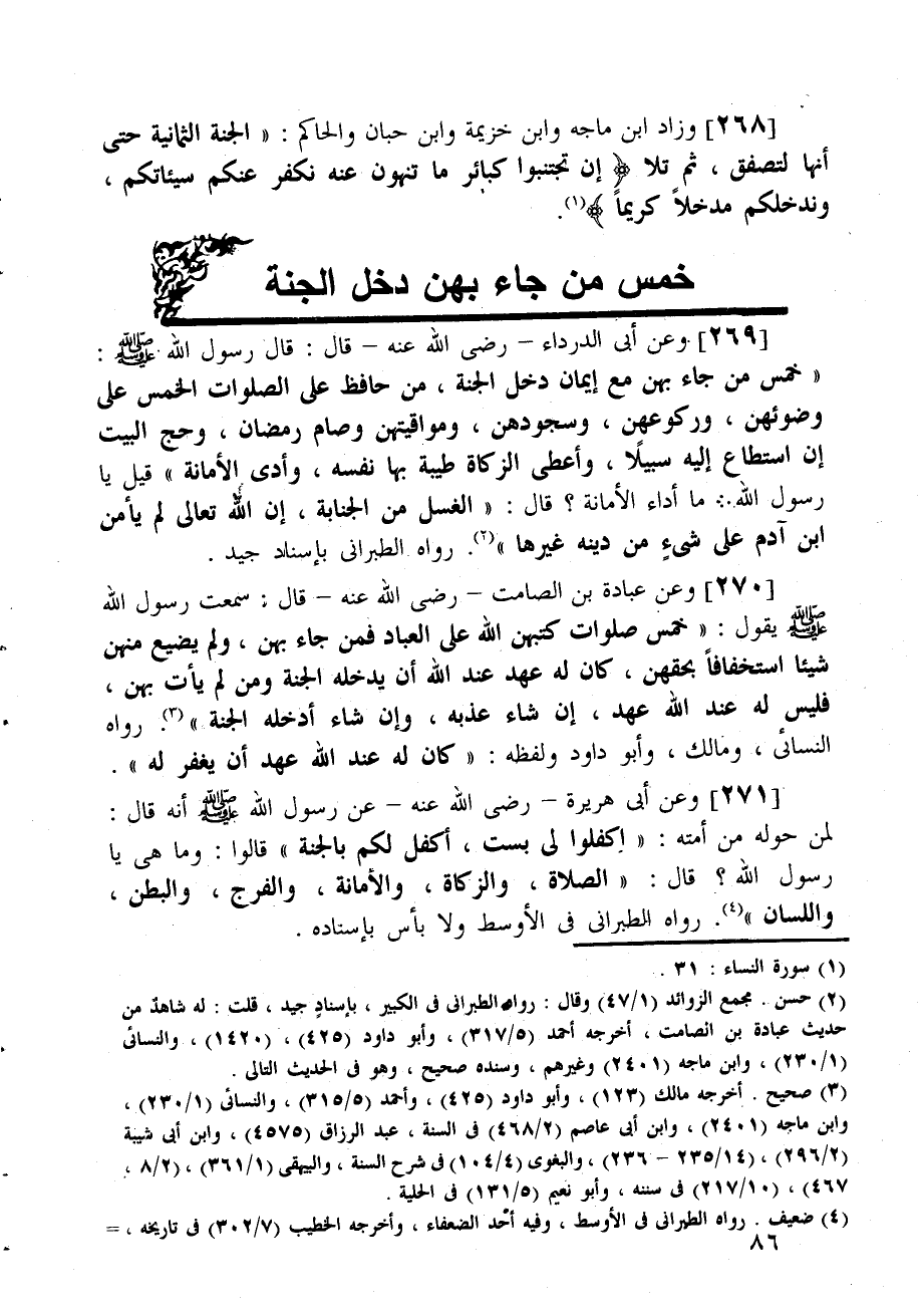 وعن أبي هريرة - رضي الله عنه - عن رسول الله صلى الله عليه وسلم أنه قال: لمن حوله من أمته: (اكفلوا لي بست، أكفل لكم بالجنة) قالوا: وماهي يا رسول الله؟ قال: (الصلاة، والزكاة، والأمانة، والفرج، والبطن، واللسان) رواه الطبراني في الأوسط ولا بأس بإسناده.