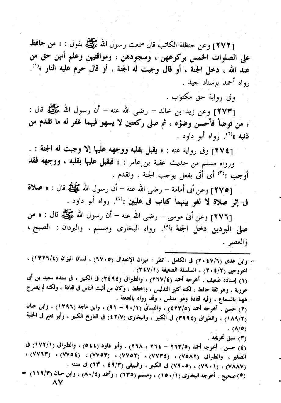 وعن حنظلة الكاتب قال سمعت رسول الله صلى الله عليه وسلم يقول: (من حافظ على الصلواتن الخمس بركوعهن، ومواقيتهن وعلم أنهن حق من عند الله، دخل الجنة، أو قال وجبت له الجنة، أو قال حرم عليه النار) . رواه أحمد بإسناد جيد.