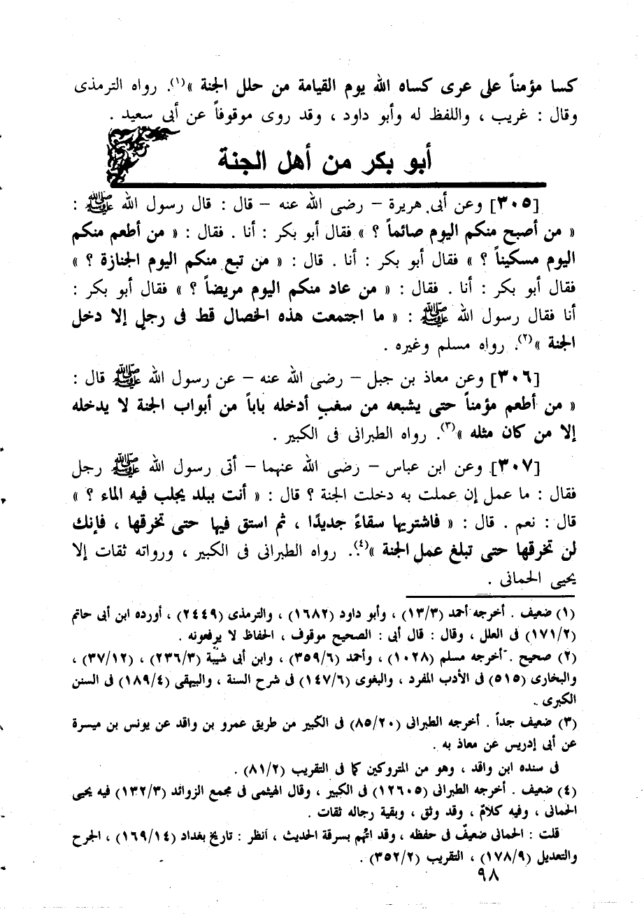 وعن أبي هريرة - رضي الله عنه - قال: قال رسول الله صلى الله عليه وسلم: (من أصبح منكم اليوم صائما) ؟ فقال أبو بكر: أنا. فقال: (من أطعم منكم اليوم مسكينا؟) فقال أبوبكر: أنا. قال: (من تبع منكم اليوم جنازة؟) فقال أبو بكر: أنا. فقال: (من عاد منكم اليوم مريضا؟) فقال أبو بكر: أنا فقال رسول الله صلى الله عليه وسلم: (ما اجتمعت هذه الخصال قط في رجل إلا دخل الجنة) رواه مسلم وغيره.