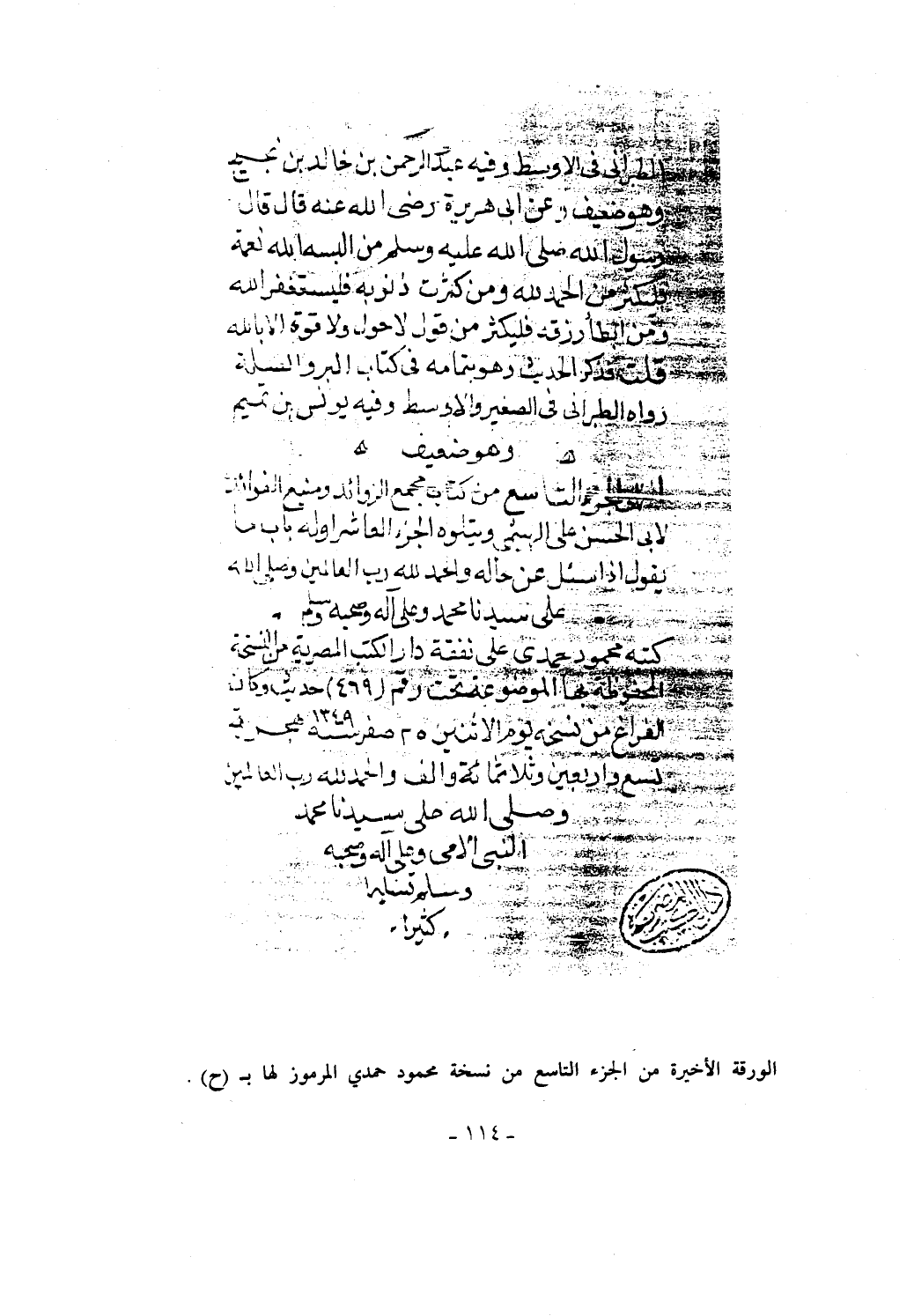 الورقة الأخيرة من الجزء التاسع من نسخة محمود حمدي المرموز لها بـ (ح).