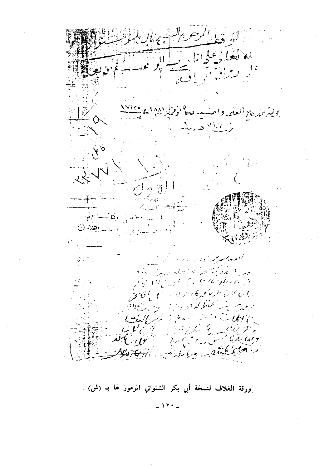 ورقة الغلاف لنسخة أبي بكر الشنواني المرموز لها بـ (ش).