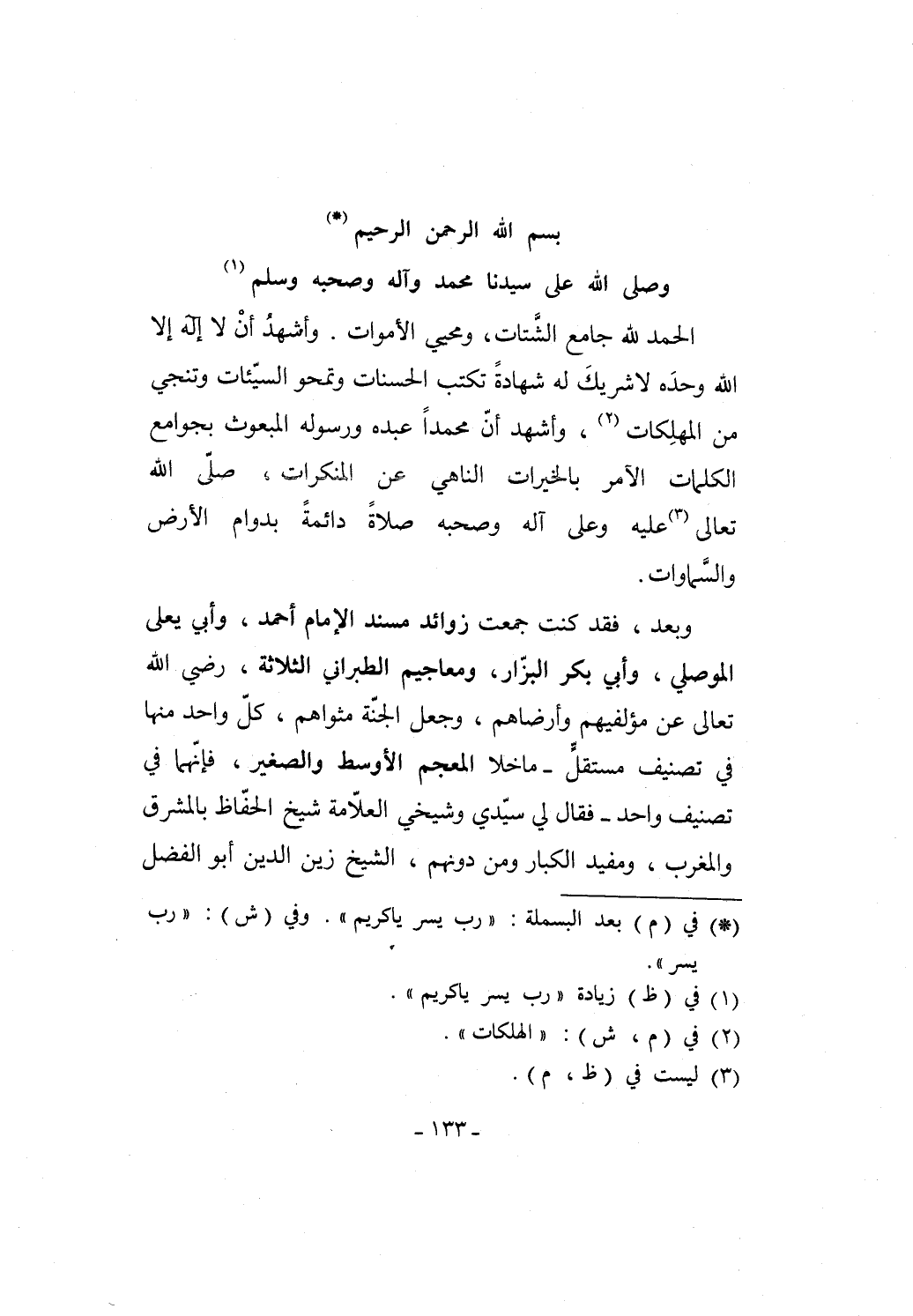 وبعد، فقد كنت جمعت زوائد مسند الإمام أَحمد، وأبي يعلى الموصلي، وأبي بكر البزّار، ومعاجيم الطبراني الثلاثة، رضي الله تعالى عن مؤلفيهم وأرضاهم، وجعل الجنّة مثواهم، كلّ واحد منها في تصنيف مستقلٍّ -ما خلا المعجم الأوسط والصغير، فإنّهما في تصنيف واحد- فقال لي سيّدي وشيخي العلّامة شيخ الحفّاظ بالمشرق والمغرب، ومفيد الكبار ومن دونهم، الشيخ زين الدين أبو الفضل