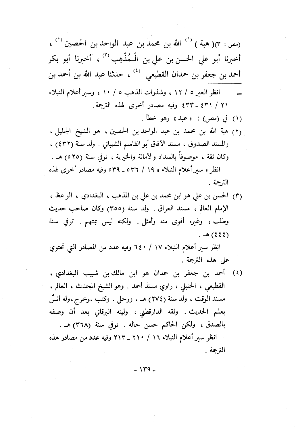 (¬2) هبة الله بن محمد بن عبد الواحد بن الحصن، هو الشيخ الجليل، والمسند الصدوق، مسند الآفاق أبو القاسم الشيباني. ولد سنة (432)، وكان ثقة، موصوفاً بالسداد والأمانة والخيرية، توفي سنة (525) هـ.