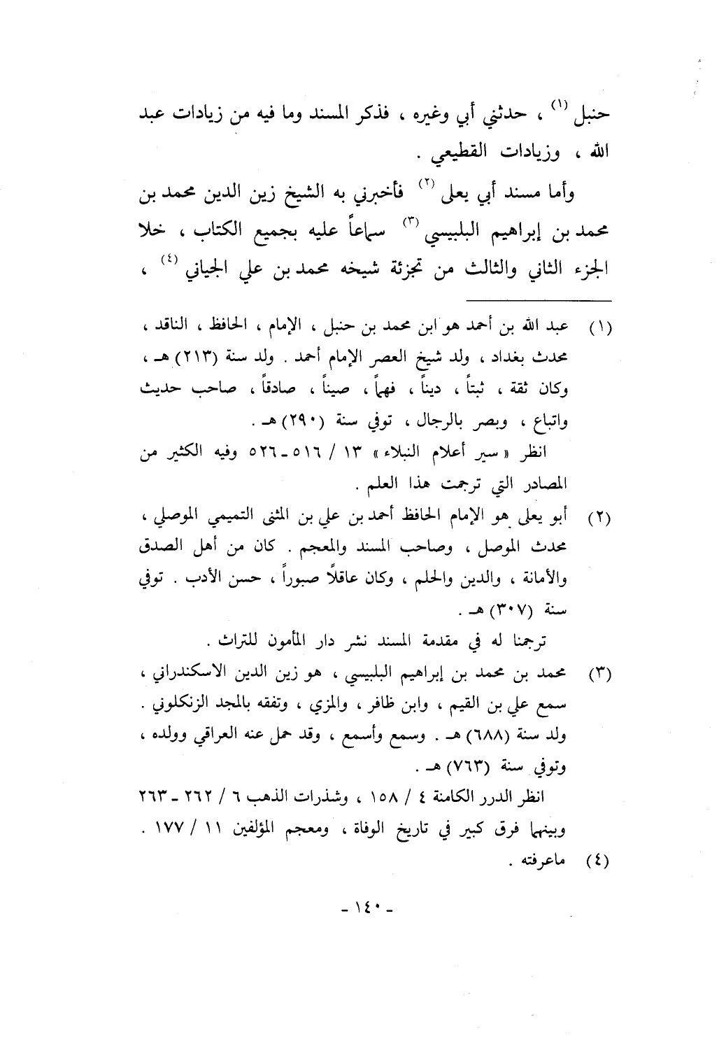 (¬1) عبد الله بن أحمد هو ابن محمد بن حنبل، الإمام، الحافظ، الناقد، محدث بغداد، ولد شيخ العصر الإمام أحمد. ولد سنة (213) هـ، وكان ثقة، ثبتاً، ديناً، فهماً، صيناً، صادقاً، صاحب حديث واتباع، وبصر بالرجال، توفي سنة (290) هـ.
