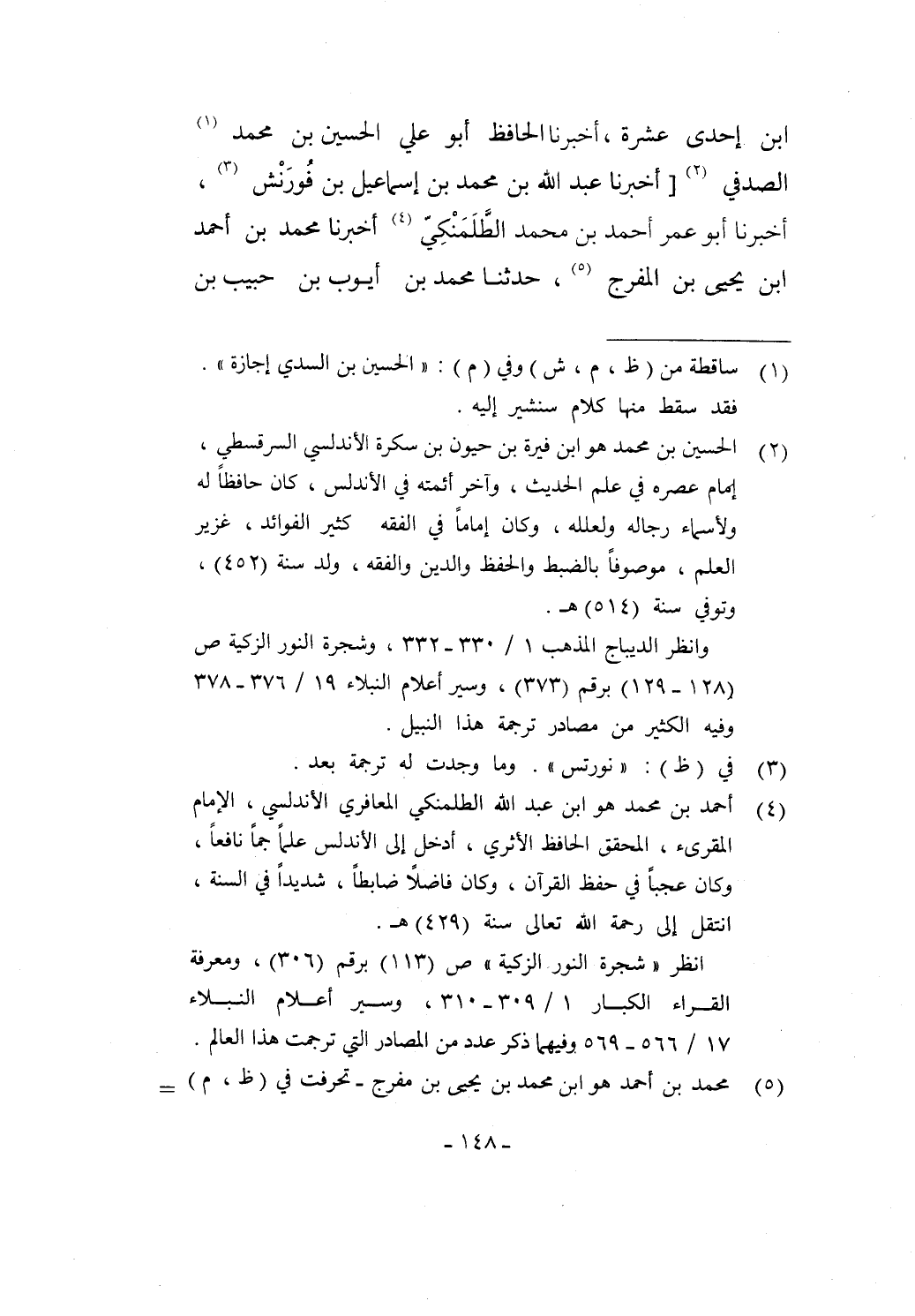 (¬2) الحسين بن محمد هو ابن فيرة بن حيون بن سكرة الأندلسي السرقسطي، إمام عصره في علم الحديث، وآخر أئمته في الأندلس، كان حافظاً له ولأسماء رجاله ولعلله، وكان إماماً في الفقه كثير الفوائد، غزير العلم، موصوفاً بالضبط والحفظ والدين والفقه، ولد سنة (452)، وتوفي سنة (514) هـ.