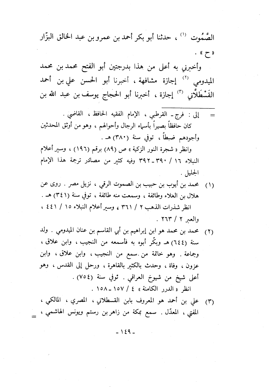 وأخبرني به أعلى من هذا بدرجتين أبو الفتح محمد بن محمد الميدومي (¬2) إجازة مشافهة، أخبرنا أبو الحسن علي بن أحمد القَسْطَلاَّني (¬3) إجازة، أخبرنا أبو الحجاج يوسف بن عبد الله بن