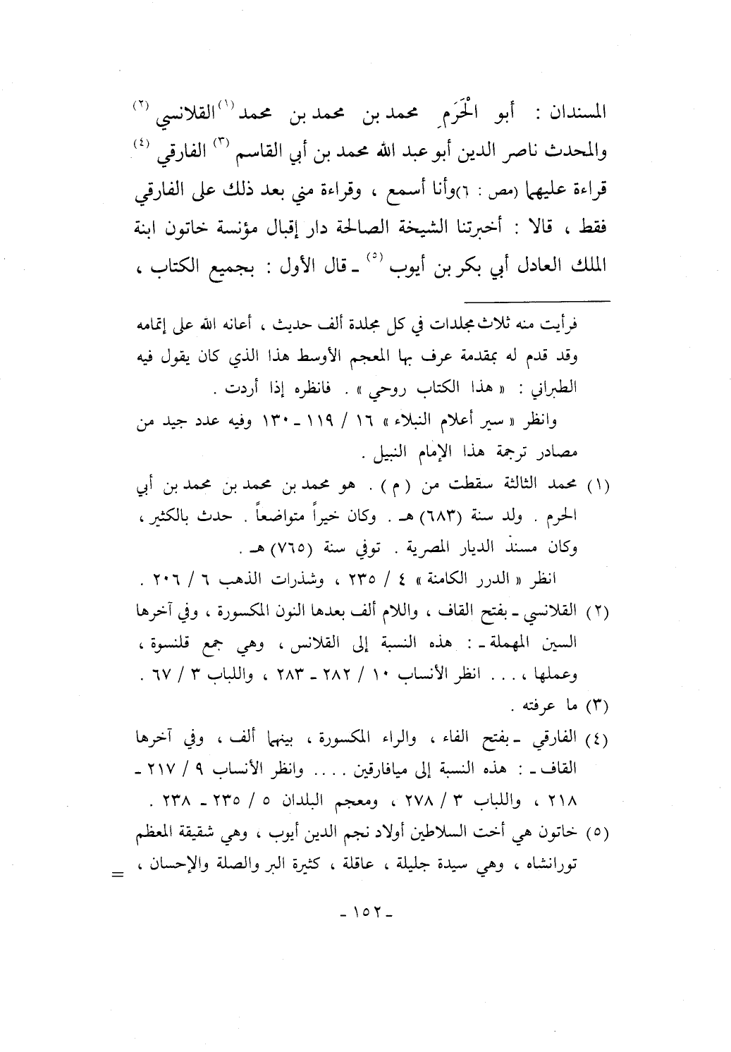 المسندان: أبو الْحَرَمِ محمد بن محمد بن محمد (¬1) القلانسي (¬2) والمحدث ناصر الدين أبو عبد الله محمد بن أبي القاسم (¬3) الفارقي (¬4) قراءة عليهما (مص: 6) وأنا أسمع، وقراءة مني بعد ذلك على الفارقي فقط، قالا: أخبرتنا الشيخة الصالحة دار إقبال مؤنسة خاتون ابنة الملك العادل أبي بكر بن أيوب (¬5) -قال الأول: بجميع الكتاب،