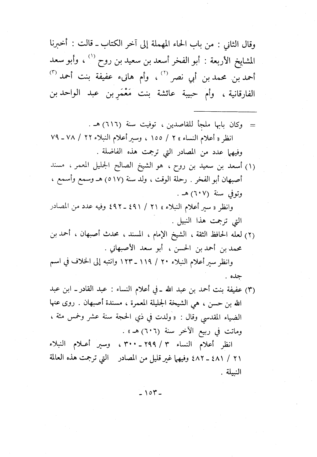 (¬3) عفيفة بنت أحمد بن عبد الله -في أعلام النساء: عبد القادر- ابن عبد الله بن حسن، هي الشيخة الجليلة المعمرة، مسندة أصبهان. روى عنها الضياء المقدسي وقال: "ولدت في ذي الحجة سنة عشر وخمس مئة، وماتت في ربيع الآخر سنة (606) هـ".