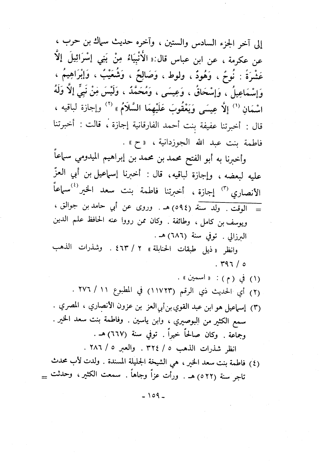 إلى آخر الجزء السادس والستين، وآخره حديث سماك بن حرب، عن عكرمة، عن ابن عباس قال: "الَأنْبِيَاءُ مِنْ بَنِي إسْرَائِيلَ إلاَّ عَشْرَةً: نُوحٌ، وَهُودٌ، ولوط، وَصَالِحٌ، وَشُعَيْبٌ، وَإبْرَاهِيمُ، وَإسْمَاعِيلُ، وَإسْحَاقُ، وَعِيسَى، وَمُحَمَّدٌ، وَلَيْسَ مِنْ نَبِيٍّ إلاَّ وَلَهُ اسْمَانِ (¬1) إلاَّ عِيسَى وَيَعْقُوبَ عَلَيْهِمَا السَّلاَمُ" (¬2) وإجازة لباقيه، قال: أخبرتنا عفيفة بنت أحمد الفارقانية إجازة، قالت: أخبرتنا فاطمة بنت عبد الله الجوزدانية، "ح".