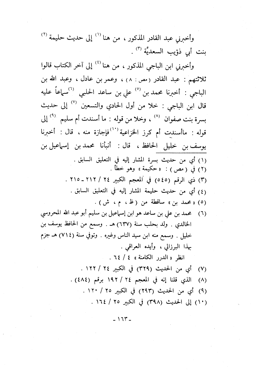 وأخبرني عبد القادر المذكور، من هنا (¬1) إلى حديث حليمة (¬2) بنت أبي ذؤيب السعديَّة (¬3).