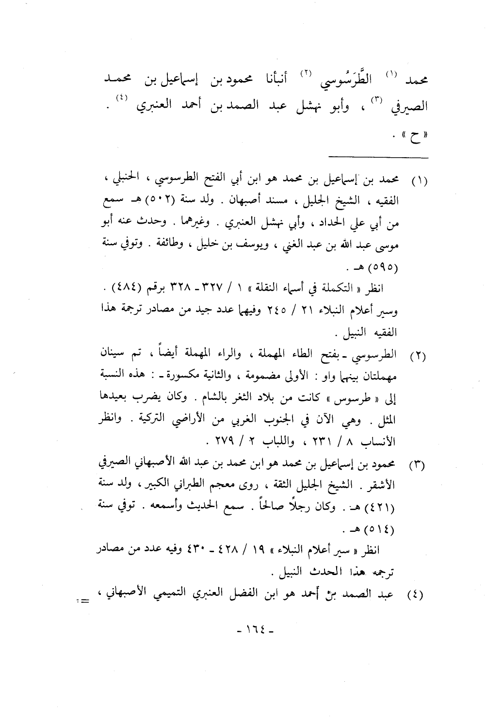 (¬3) محمود بن إسماعيل بن محمد هو ابن محمد بن عبد الله الأصبهاني الصيرفي الأشقر. الشيخ الجليل الثقة، روى معجم الطبراني الكبير، ولد سنة (421) هـ. وكان رجلاً صالحاً. سمع الحديث وأسمعه. توفي سنة (514) هـ.