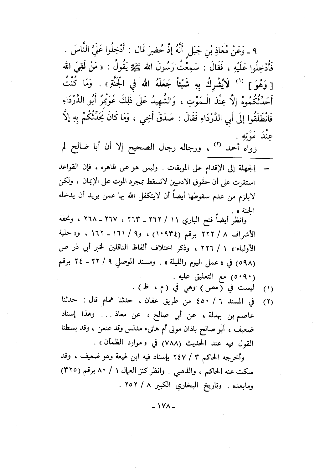 9 - وَعَنْ مُعَاذِ بْنِ جَبَلٍ أَنَهُ إذْ حُضِرَ قَال: أَدْخِلُوا عَلَيَّ النَاسَ. فَأُدْخِلُوا عَلَيْهِ، فَقَالَ: سَمِعْتُ رَسُولَ الله - صلى الله عليه وسلم - يَقُولُ: "مَنْ لَقِيَ الله [وَهُوَ] (¬1) لاَ يُشْرِكُ بِهِ شَيْئاً جَعَلَهُ الله في الْجَنَّةِ". وَمَا كُنْتُ أَحَدِّثُكُمُوهُ إلَّا عِنْدَ الْمَوْتِ، وَالشَهِيدُ عَلَى ذَلِكَ عُوَيمِرٌ أَبُو الدَّرْدَاءِ فَانْطَلَقُوا إلَى أَبِي الدَّرْدَاءِ فَقَالَ: صَدَقَ أَخِي، وَمَا كَانَ يَحَدَّثُكُمْ بِهِ إلاَّ عِنْدَ مَوْتِهِ.