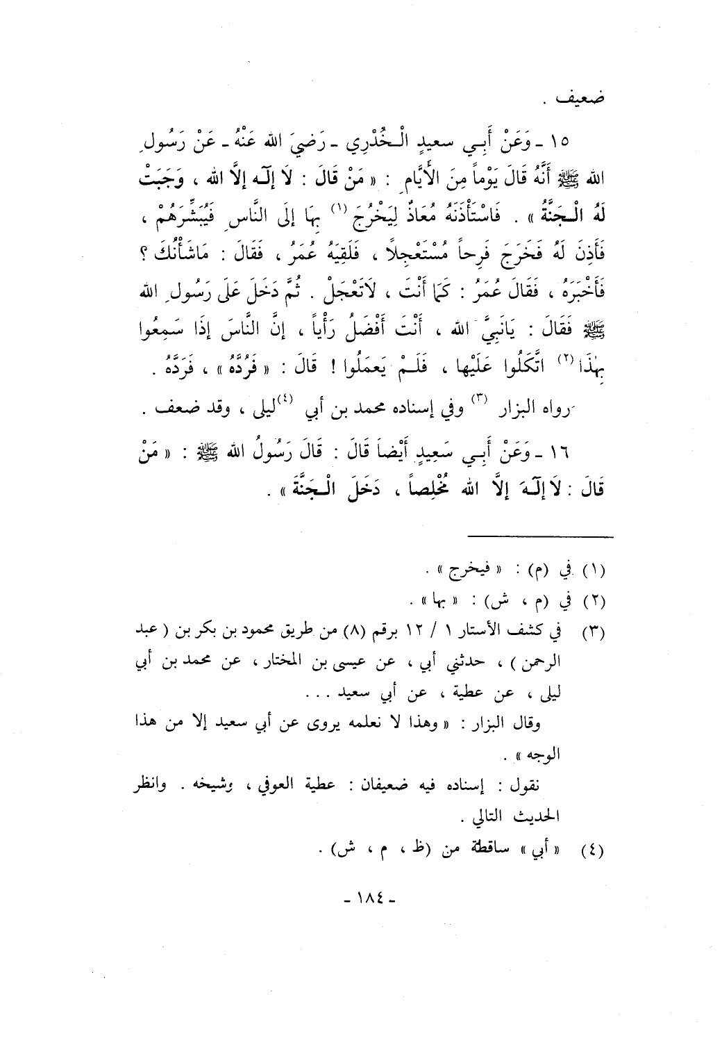 (¬3) في كشف الأستار 1/ 12 برقم (8) من طريق محمود بن بكر بن (عبد الرحمن)، حدثني أبي، عن عيسى بن المختار، عن محمد بن أبي ليلى، عن عطية، عن أبي سعيد ...