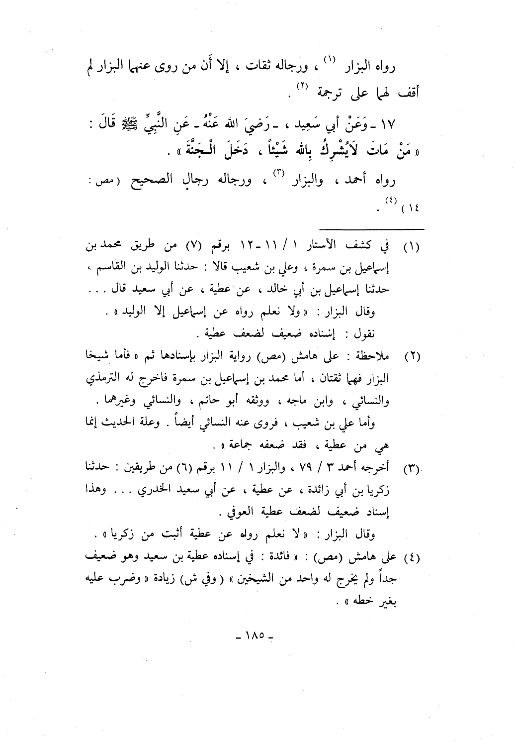 (¬2) ملاحظة: على هامش (مص) رواية البزار بإسنادها ثم "فأما شيخا البزار فهما ثقتان، أما محمد بن إسماعيل بن سمرة فأخرج له الترمذي والنسائي، وابن ماجه، ووثقه أبو حاتم، والنسائي وغيرهما.