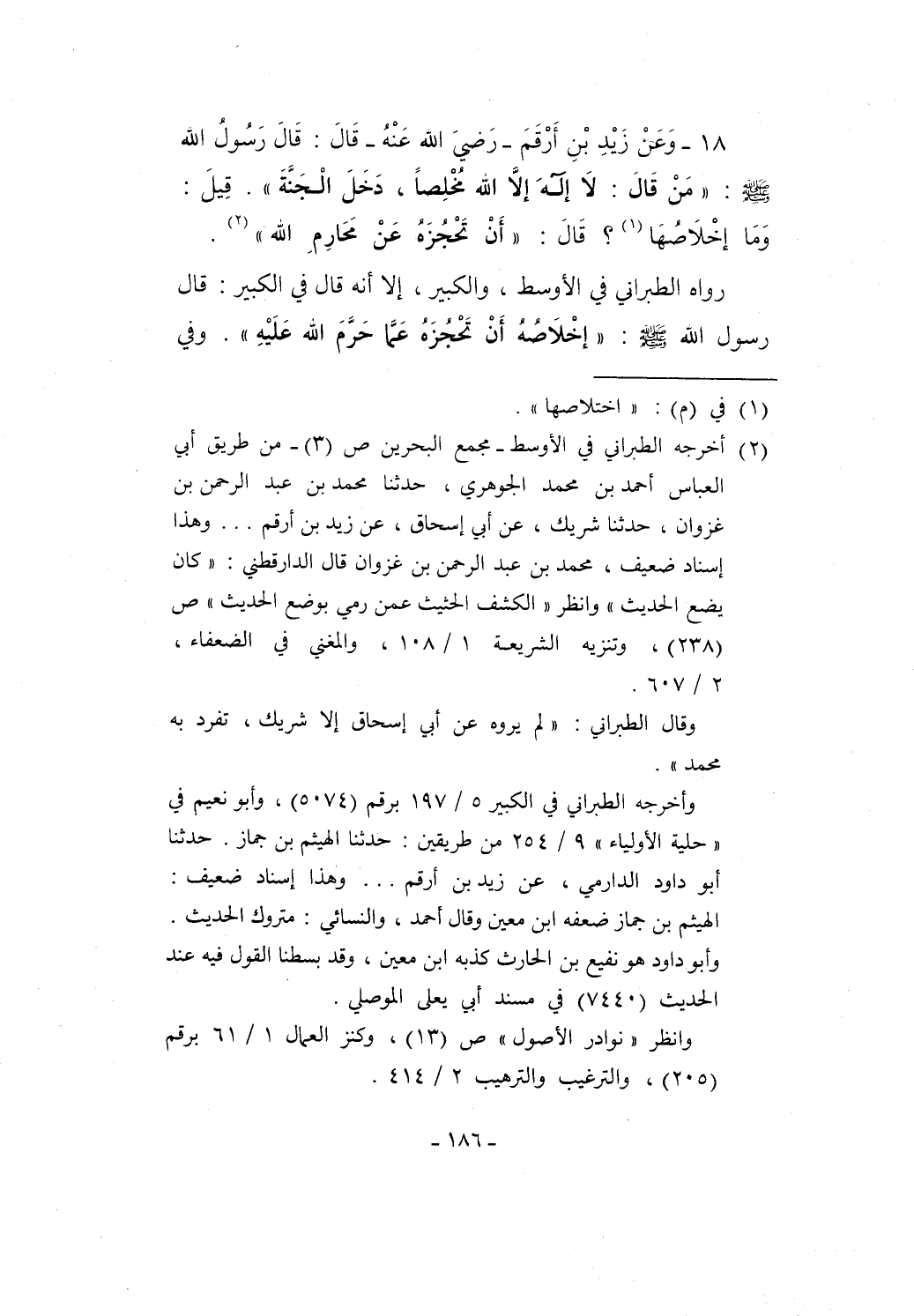 18 - وَعَنْ زَيْدِ بْنِ أَرْقَمَ -رَضيَ الله عَنْهُ- قَالَ: قَالَ رَسُولُ الله - صلى الله عليه وسلم -: "مَنْ قَالَ: لاَ إِلَهَ إلَّا الله مُخْلِصاً، دَخَلَ الْجَنَّةَ". قِيلَ: وَمَا إخْلاَصُهَا (¬1)؟ قَالَ: "أَنْ تَحْجُزَهُ عَنْ مَحَارِمِ الله" (¬2).