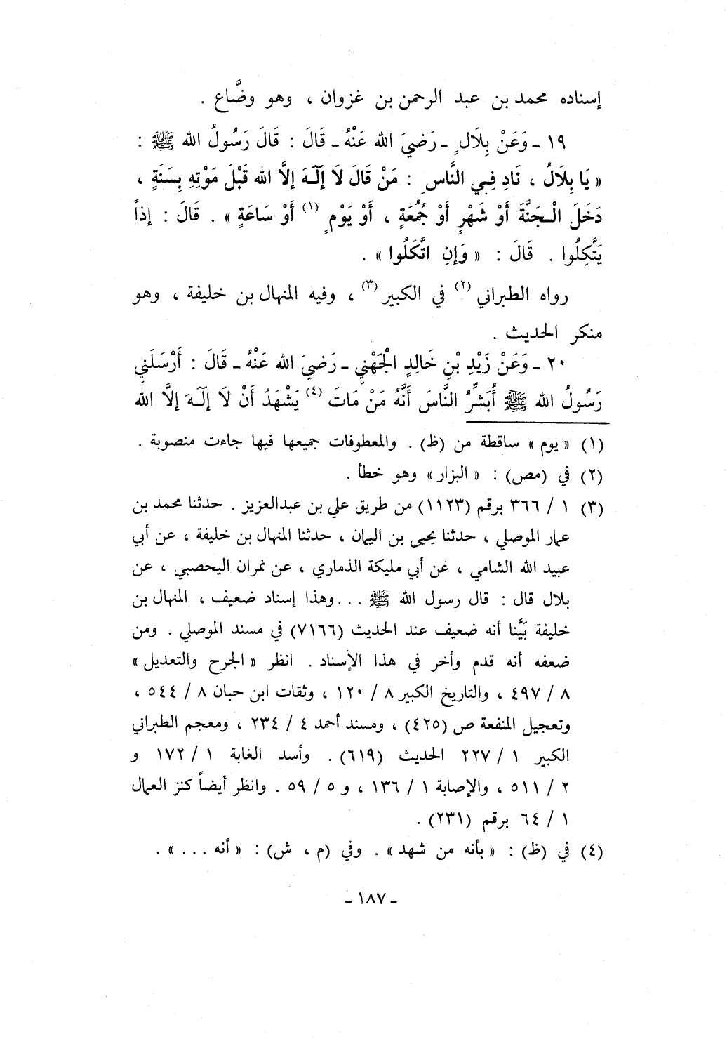 19 - وَعَنْ بِلاَلٍ -رَضيَ الله عَنْهُ- قَالَ: قَالَ رَسُولُ الله - صلى الله عليه وسلم -: "يَا بِلاَلُ، نَادِ فِي النَّاسِ: مَنْ قَالَ لاَ إِلَهَ إلا الله قَبْلَ مَوْتِهِ بِسَنَةٍ، دَخَلَ الْجَنَّةَ أَوْ شَهْرٍ أَوْ جُمْعَةٍ، أَوْ يَوْمٍ (¬1) أَوْ ساعَةٍ". قَالَ: إذاً يَتَّكِلُوا. قَالَ: "وَإنِ اتَّكَلُوا".