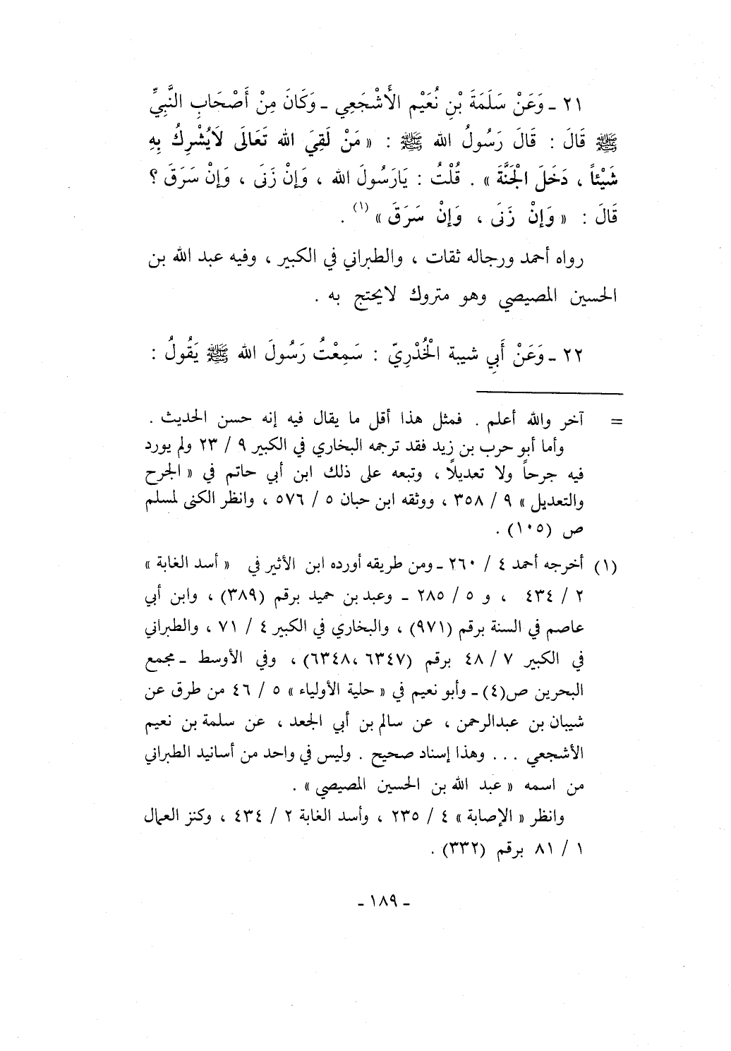 (¬1) أخرجه أحمد 4/ 260 - ومن طريقه أورده ابن الأثير في "أسد الغابة" 2/ 434، و5/ 285 - وعبد بن حميد برقم (389)، وابن أبي عاصم في السنة برقم (971)، والبخاري في الكبير 4/ 71، والطبراني في الكبير 7/ 48 برقم (6347، 6348)، وفي الأوسط -مجمع البحرين ص (4) - وأبو نعيم في "حلية الأولياء" 5/ 46 من طرق عن شيبان بن عبد الرحمن، عن سالم بن أبي الجعد، عن سلمة بن نعيم الأشجعي ... وهذا إسناد صحيح. وليس في واحد من أسانيد الطبراني من اسمه "عبد الله بن الحسن المصيصي".