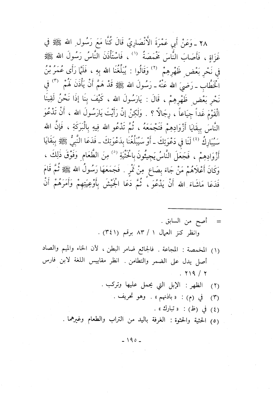 28 - وَعَنْ أَبي عَمْرَةَ الَأنْصارِيّ قَال كُنَا مَعَ رَسُولِ الله - صلى الله عليه وسلم - في غَزَاةٍ، فَأَصَابَ النَّاسَ مَخْمَصَةٌ (¬1)، فَاسْتَأْذَنَ النَّاسُ رَسُولَ الله - صلى الله عليه وسلم - فِي نَحْرِ بَعْضِ ظَهْرِهِمْ (¬2) وَقَالُوا: يُبَلِّغُنَا الله بِهِ، فَلَمَّا رَأَى عُمَرُ بْنُ الْخَطَّابِ -رَضيَ الله عَنْهُ- رَسُولَ الله - صلى الله عليه وسلم - قَدْ هَمَّ أَنْ يَأذَنَ لَهُمْ (¬3) فِي نَحْرِ بَعْضِ ظَهْرِهِمْ، قَال: يَا رَسُولَ الله، كَيْفَ بِنَا إذَا نَحْنُ لَقِينَا الْقَوْمَ غَداً جِيَاعاً، رِجَالاً؟. وَلكِنْ إنْ رَأَيْتَ يَا رَسُولَ الله، أَنْ تَدْعُوَ النَّاسَ بِبِقَايَا أَزْوَادِهِمْ فَتَجْمَعَهُ، ثُمَ تَدْعُو الله فِيهِ بِالْبَرَكَةِ، فَإنَّ الله سَيُبَارِكُ (¬4) لَنَا فِي دَعْوَتِكَ -أَوْ سَيُبَلِّغُنَا بِدَعْوَتِكَ- فَدَعَا النَّبي - صلى الله عليه وسلم - ببَقَايَا أَزْوَادِهِمْ، فَجَعَلَ النَّاسُ يَجِيئُونَ بِالْحَثْيَةِ (¬5) مِنَ الطَّعَامِ وَفَوْقَ ذلِكَ، وَكَانَ أَعْلاَهُمْ مَنْ جَاءَ بِصاعٍ مِنْ تَمْرٍ. فَجَمَعَهَا رَسُولُ الله - صلى الله عليه وسلم - ثمَّ قَامَ فَدَعَا مَا شَاءَ. الله أَنْ يَدْعُوَ، ثُمَّ دَعَا الْجَيْشَ بِأَوْعِيَتِهِمْ وَأَمَرَهُمْ أَنْ