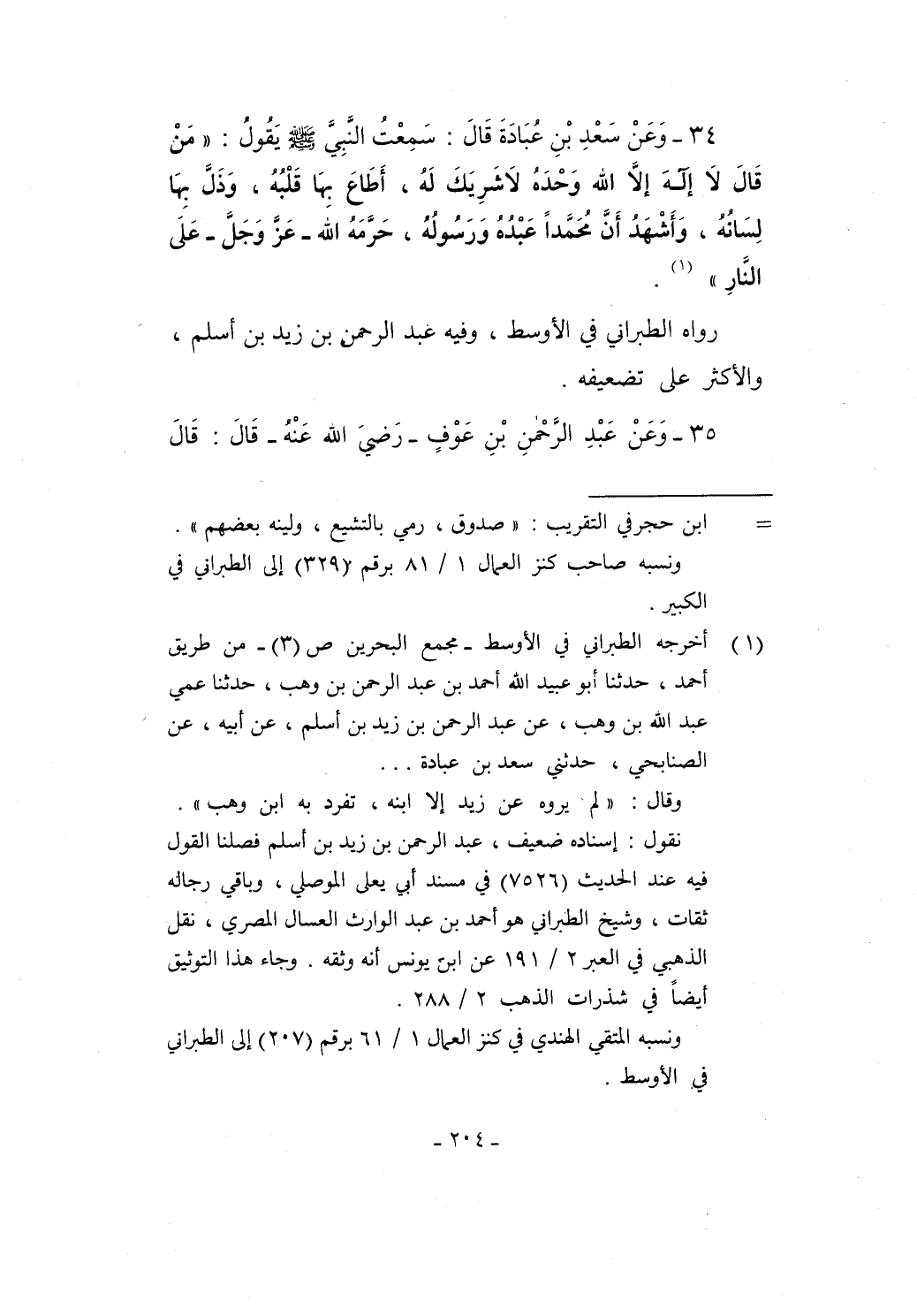 (¬1) أخرجه الطبراني في الأوسط -مجمع البحرين ص (3) - من طريق أحمد، حدثنا أبو عبيد الله أحمد بن عبد الرحمن بن وهب، حدثنا عمي عبد الله بن وهب، عن عبد الرحمن بن زيد بن أسلم، عن أبيه، عن الصنابحي، حدثني سعد بن عبادة ...