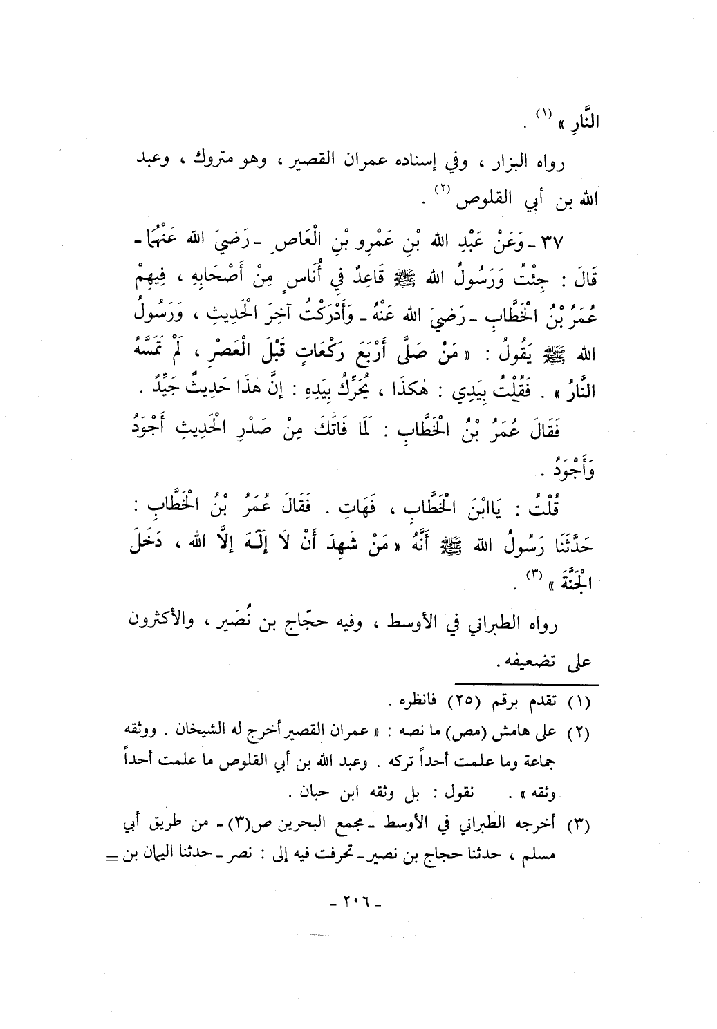 37 - وَعَنْ عَبْدِ الله بْنِ عَمْرِو يْنِ الْعَاصِ -رَضيَ اللهُ عَنهُمَا- قَالَ: جِئْتُ وَرَسُولُ الله - صلى الله عليه وسلم - قَاعِدٌ فِي أُنَاسٍ مِنْ أَصْحَابِهِ، فِيهِمْ عُمَرُ بْنُ الْخَطَّابِ -رَضيَ الله عَنْهُ- وَأَدْرَكْتُ آخِرَ الْحَدِيثِ، وَرَسُولُ الله - صلى الله عليه وسلم - يقُولُ: "مَنْ صَلَّى أَرْبَعَ رَكْعَاتٍ قَبْلَ الْعَصْرِ، لَمْ تَمَسَّهُ النَّارُ". فَقُلْتُ بِيَدِي: هكذَا، يُحَرِّكُ بِيَدِهِ: إنَّ هذَا حَدِيثٌ جَيِّدٌ.
