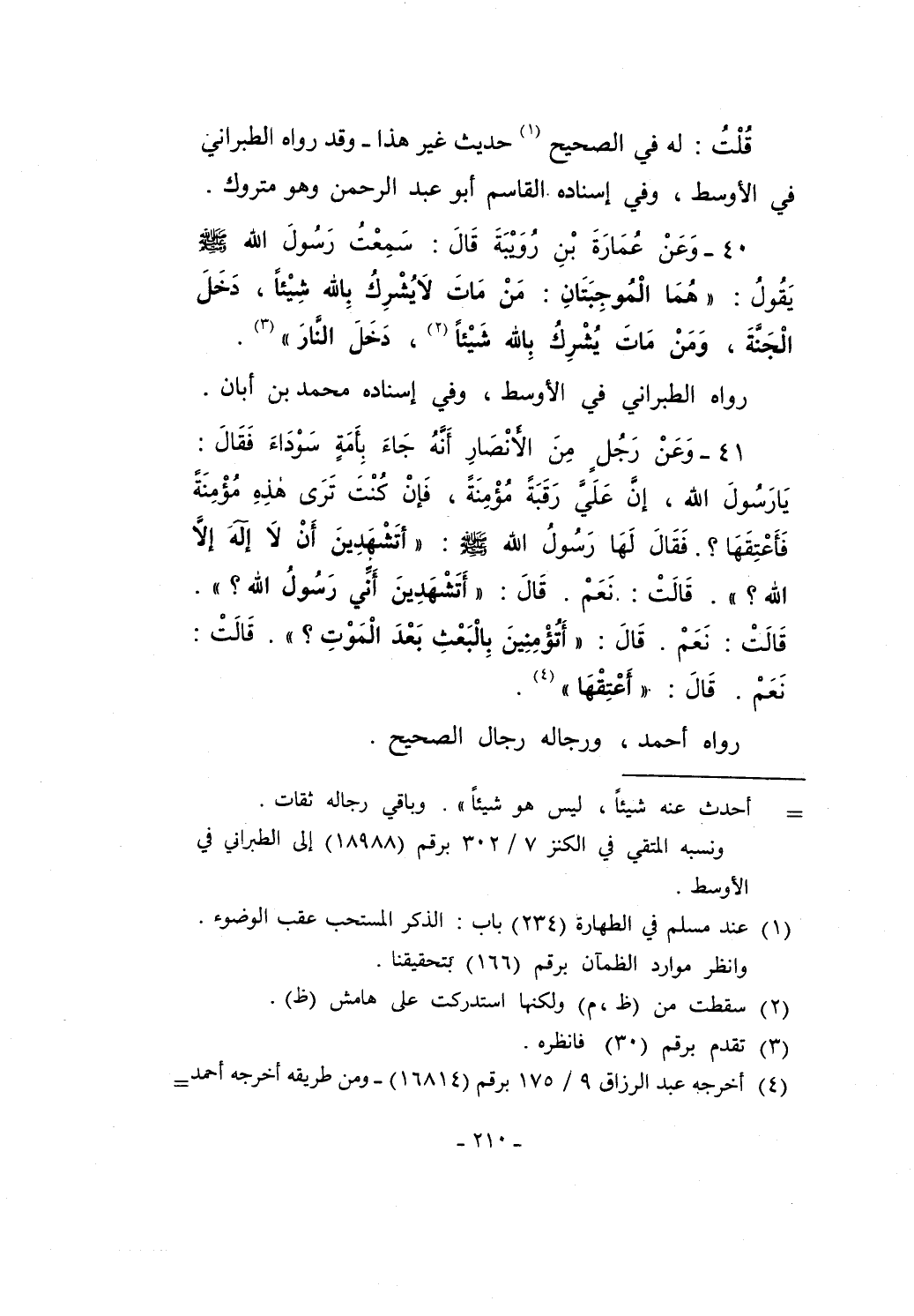 41 - وَعَنْ رَجُل مِنَ الأنْصَارِ أَنَّهُ جَاءَ بِأَمَةٍ سَوْدَاءَ فَقَالَ: يَا رَسُولَ الله، إنَّ عَلَيَّ رَقَبَةً مُؤْمِنَةً، فَإنْ كُنْتَ تَرَى هذِهِ مُؤْمِنَةً فَأَعْتِقَهَا؟. فَقَالَ لَهَا رَسُولُ الله - صلى الله عليه وسلم -: "أتَشْهَدِينَ أَنْ لاَ إِلهَ إلاَّ الله؟ ". قَالَتْ: نَعَمْ. قَالَ: "أَتَشْهَدِينَ أَنِّي رَسُولُ الله؟ ". قَالَتْ: نَعَمْ. قَالَ: "أَتُؤْمِنِينَ بِالْبَعْثِ بَعْدَ الْمَوْتِ؟ ". قَالَتْ: نَعَمْ. قَالَ: "أَعْتِقْهَا" (¬4).